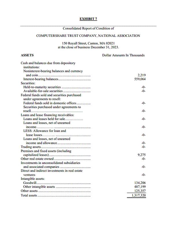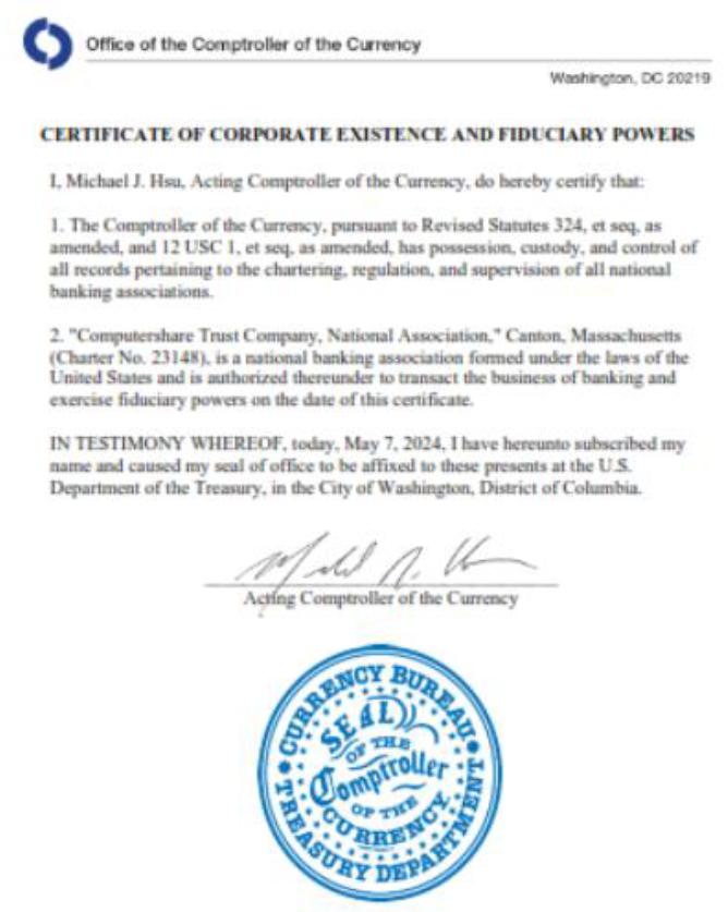 A copy of the Comptroller of the Currency Certification of Fiduciary Powers for Computershare Trust Company, National Association, dated May 7, 2024.
