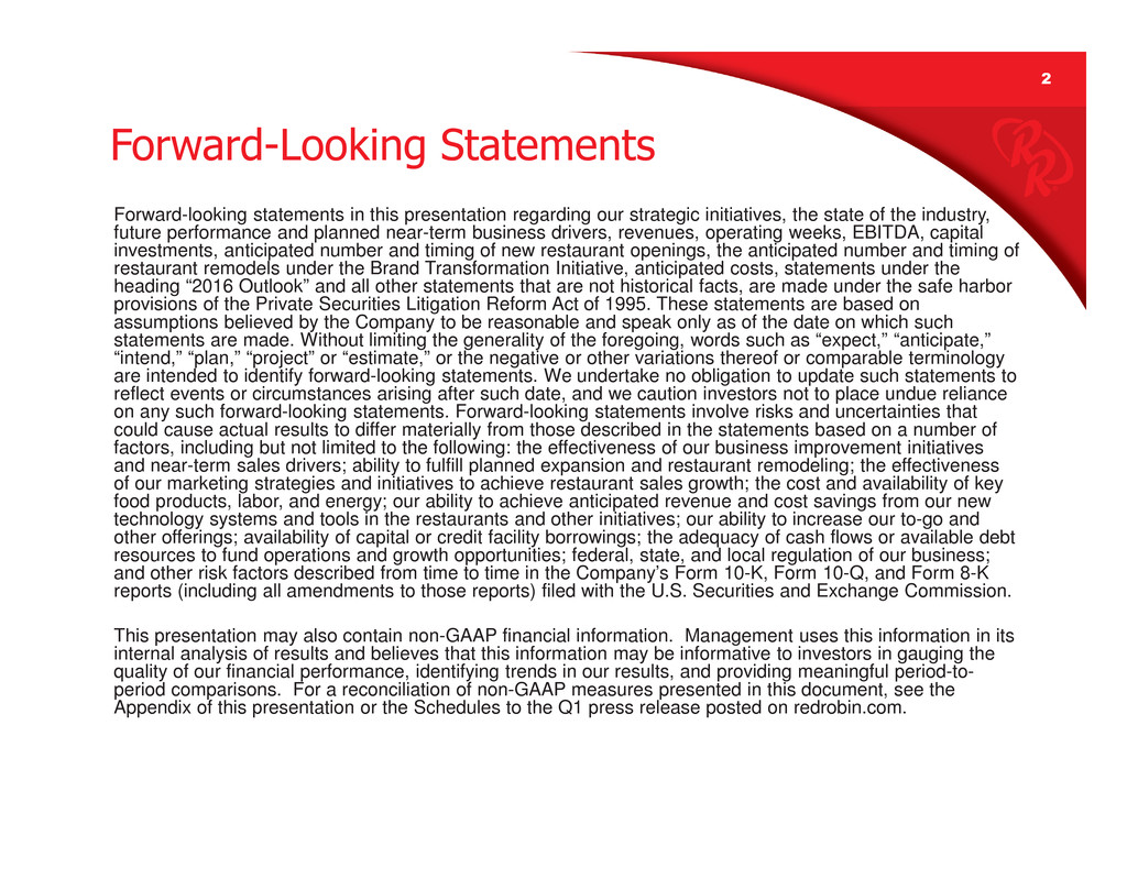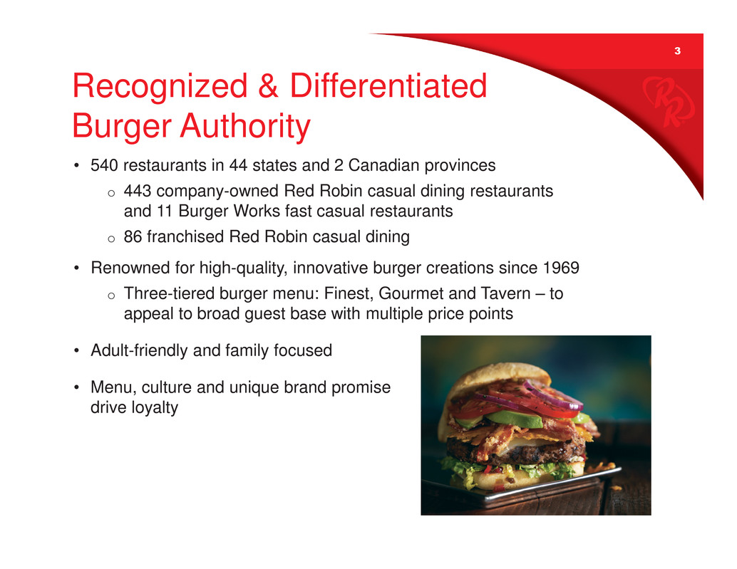2 Forward-looking statements in this presentation regarding our strategic initiatives, the state of the industry, future performance and planned near-term business drivers, revenues, operating weeks, EBITDA, capital investments, anticipated number and timing of new restaurant openings, the anticipated number and timing of restaurant remodels under the Brand Transformation Initiative, anticipated costs, statements under the heading “2016 Outlook” and all other statements that are not historical facts, are made under the safe harbor provisions of the Private Securities Litigation Reform Act of 1995. These statements are based on assumptions believed by the Company to be reasonable and speak only as of the date on which such statements are made. Without limiting the generality of the foregoing, words such as “expect,” “anticipate,” “intend,” “plan,” “project” or “estimate,” or the negative or other variations thereof or comparable terminology are intended to identify forward-looking statements. We undertake no obligation to update such statements to reflect events or circumstances arising after such date, and we caution investors not to place undue reliance on any such forward-looking statements. Forward-looking statements involve risks and uncertainties that could cause actual results to differ materially from those described in the statements based on a number of factors, including but not limited to the following: the effectiveness of our business improvement initiatives and near-term sales drivers; ability to fulfill planned expansion and restaurant remodeling; the effectiveness of our marketing strategies and initiatives to achieve restaurant sales growth; the cost and availability of key food products, labor, and energy; our ability to achieve anticipated revenue and cost savings from our new technology systems and tools in the restaurants and other initiatives; our ability to increase our to-go and other offerings; availability of capital or credit facility borrowings; the adequacy of cash flows or available debt resources to fund operations and growth opportunities; federal, state, and local regulation of our business; and other risk factors described from time to time in the Company’s Form 10-K, Form 10-Q, and Form 8-K reports (including all amendments to those reports) filed with the U.S. Securities and Exchange Commission. This presentation may also contain non-GAAP financial information. Management uses this information in its internal analysis of results and believes that this information may be informative to investors in gauging the quality of our financial performance, identifying trends in our results, and providing meaningful period-to- period comparisons. For a reconciliation of non-GAAP measures presented in this document, see the Appendix of this presentation or the Schedules to the Q1 press release posted on redrobin.com. Forward-Looking Statements