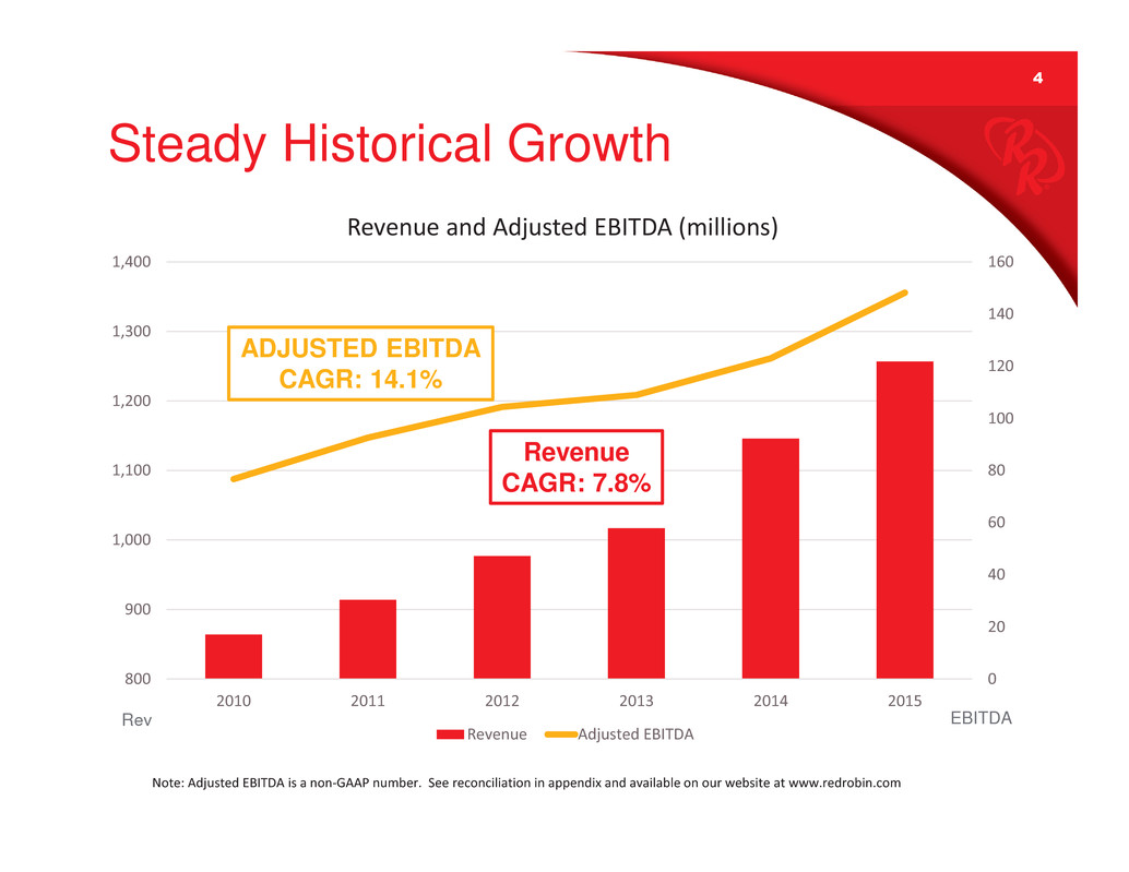 3 Recognized & Differentiated Burger Authority • 540 restaurants in 44 states and 2 Canadian provinces o 443 company-owned Red Robin casual dining restaurants and 11 Burger Works fast casual restaurants o 86 franchised Red Robin casual dining • Renowned for high-quality, innovative burger creations since 1969 o Three-tiered burger menu: Finest, Gourmet and Tavern – to appeal to broad guest base with multiple price points • Adult-friendly and family focused • Menu, culture and unique brand promise drive loyalty
