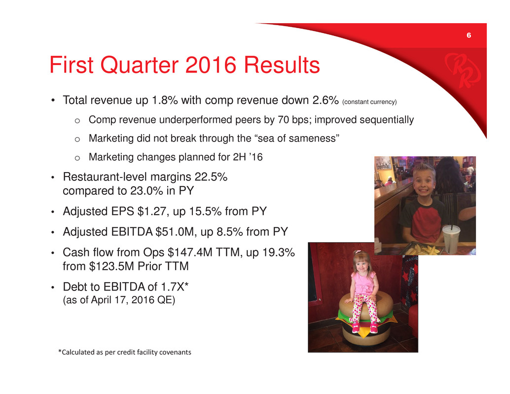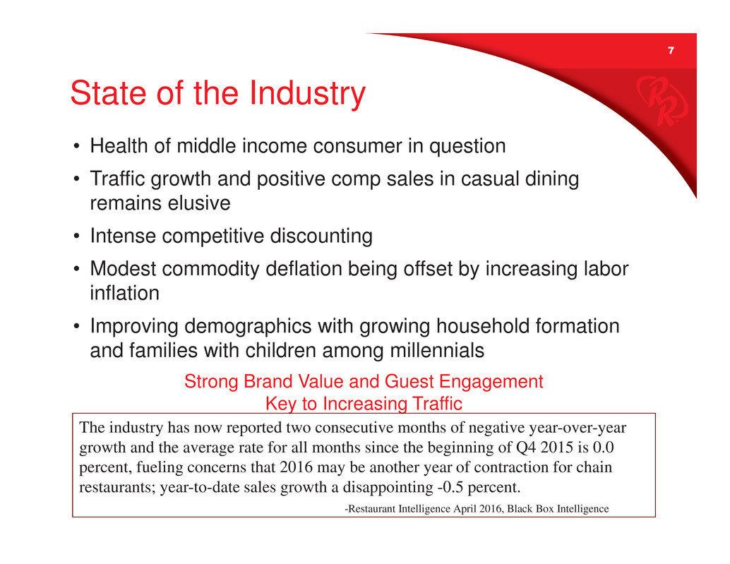 6 First Quarter 2016 Results • Total revenue up 1.8% with comp revenue down 2.6% (constant currency) o Comp revenue underperformed peers by 70 bps; improved sequentially o Marketing did not break through the “sea of sameness” o Marketing changes planned for 2H ’16 • Restaurant-level margins 22.5% compared to 23.0% in PY • Adjusted EPS $1.27, up 15.5% from PY • Adjusted EBITDA $51.0M, up 8.5% from PY • Cash flow from Ops $147.4M TTM, up 19.3% from $123.5M Prior TTM • Debt to EBITDA of 1.7X* (as of April 17, 2016 QE) ????????????????????????????????????????????
