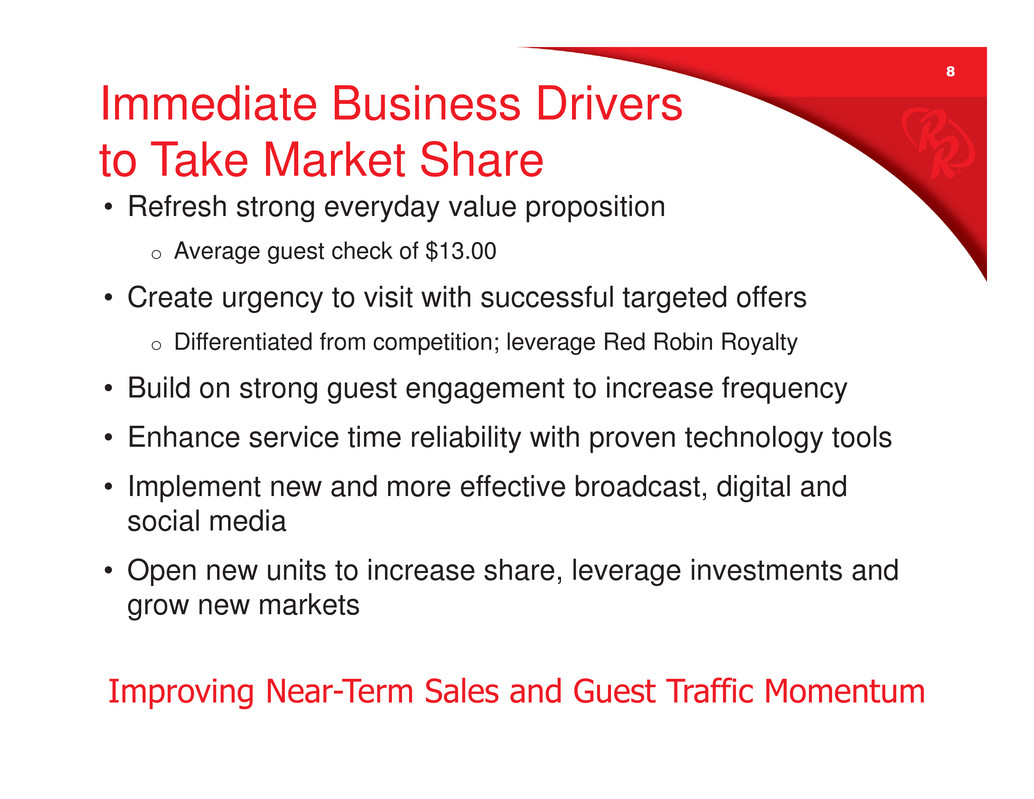 8 Immediate Business Drivers to Take Market Share • Refresh strong everyday value proposition o Average guest check of $13.00 • Create urgency to visit with successful targeted offers o Differentiated from competition; leverage Red Robin Royalty • Build on strong guest engagement to increase frequency • Enhance service time reliability with proven technology tools • Implement new and more effective broadcast, digital and social media • Open new units to increase share, leverage investments and grow new markets Improving Near-Term Sales and Guest Traffic Momentum