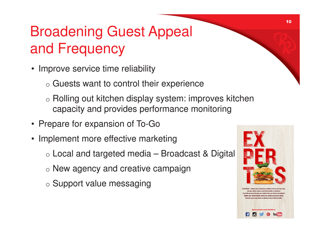 9 Reinforce Compelling Value Issues • Speed-of-service compromised • Bottomless proposition not consistently delivered • Guests want more compelling offers/deals • Tavern value tier has lacked fresh news and variety • Heavy focus on Finest tier drove sense of high prices Initiatives in Test or Implementation • Kitchen Display System improving speed and productivity • New Tavern value-oriented menu items attracting new guests • Operational initiatives to ensure delivery of Bottomless and other brand promises supported by detailed tracking of Net Promoter Score and mystery shops