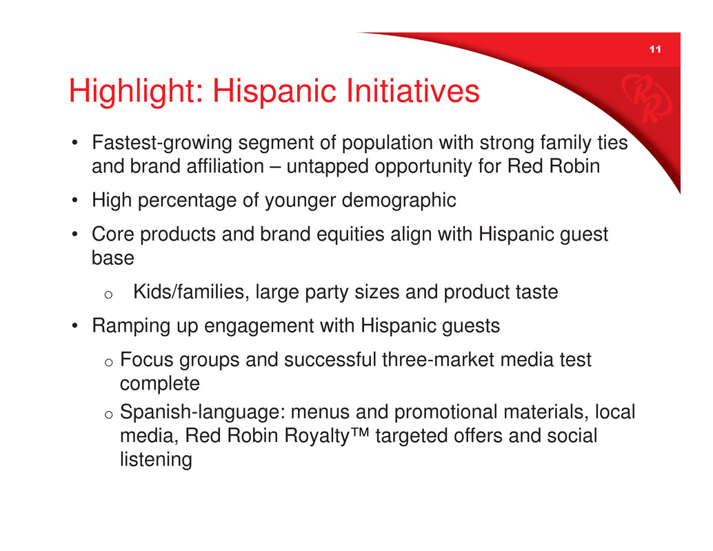 11 Highlight: Hispanic Initiatives • Fastest-growing segment of population with strong family ties and brand affiliation – untapped opportunity for Red Robin • High percentage of younger demographic • Core products and brand equities align with Hispanic guest base o Kids/families, large party sizes and product taste • Ramping up engagement with Hispanic guests o Focus groups and successful three-market media test complete o Spanish-language: menus and promotional materials, local media, Red Robin Royalty™ targeted offers and social listening