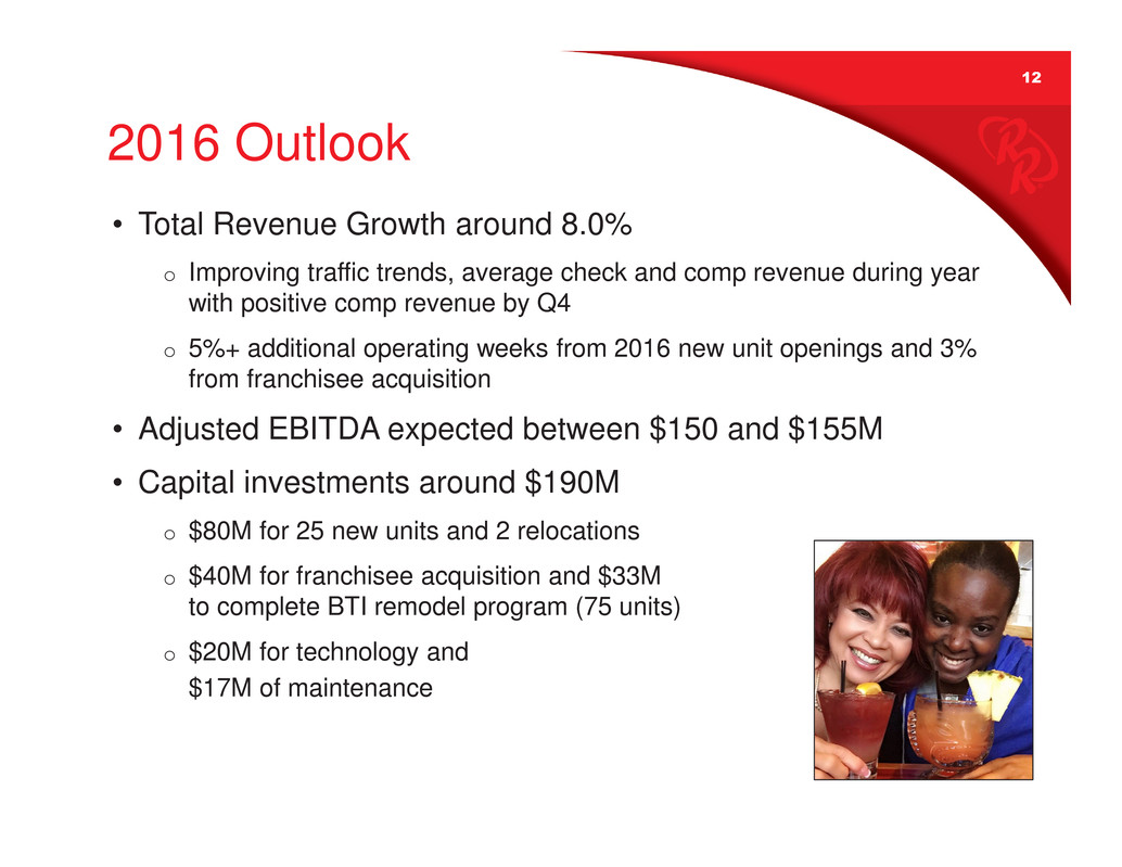 12 2016 Outlook • Total Revenue Growth around 8.0% o Improving traffic trends, average check and comp revenue during year with positive comp revenue by Q4 o 5%+ additional operating weeks from 2016 new unit openings and 3% from franchisee acquisition • Adjusted EBITDA expected between $150 and $155M • Capital investments around $190M o $80M for 25 new units and 2 relocations o $40M for franchisee acquisition and $33M to complete BTI remodel program (75 units) o $20M for technology and $17M of maintenance