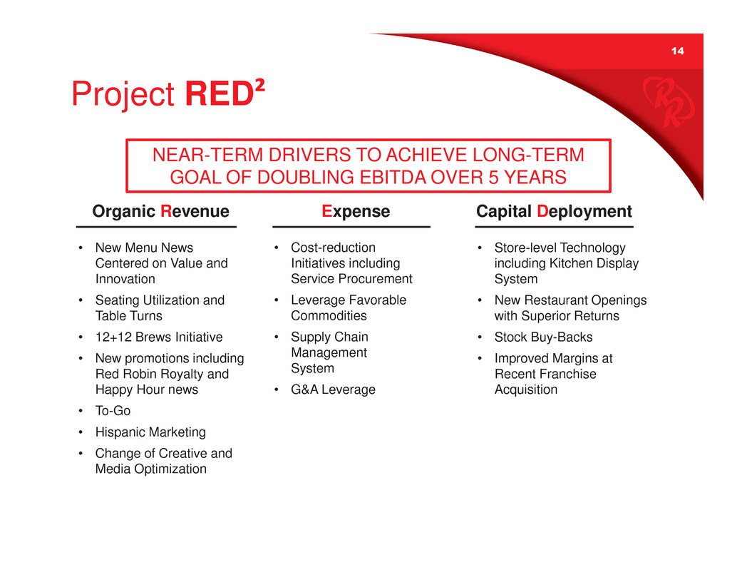 14 NEAR-TERM DRIVERS TO ACHIEVE LONG-TERM GOAL OF DOUBLING EBITDA OVER 5 YEARS • New Menu News Centered on Value and Innovation • Seating Utilization and Table Turns • 12+12 Brews Initiative • New promotions including Red Robin Royalty and Happy Hour news • To-Go • Hispanic Marketing • Change of Creative and Media Optimization • Store-level Technology including Kitchen Display System • New Restaurant Openings with Superior Returns • Stock Buy-Backs • Improved Margins at Recent Franchise Acquisition • Cost-reduction Initiatives including Service Procurement • Leverage Favorable Commodities • Supply Chain Management System • G&A Leverage Organic Revenue Expense Capital Deployment Project RED?