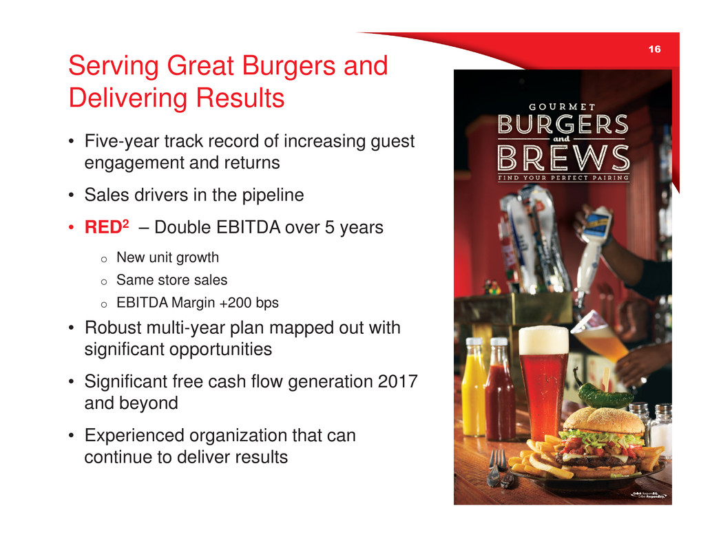 16 Serving Great Burgers and Delivering Results • Five-year track record of increasing guest engagement and returns • Sales drivers in the pipeline • RED2 – Double EBITDA over 5 years o New unit growth o Same store sales o EBITDA Margin +200 bps • Robust multi-year plan mapped out with significant opportunities • Significant free cash flow generation 2017 and beyond • Experienced organization that can continue to deliver results