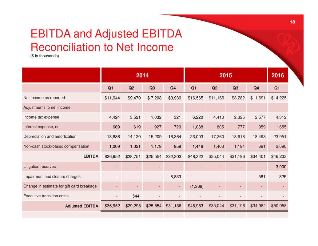 19 Reconciliation of Adjusted Net Income to Net Income and Adjusted Earnings Per Diluted Share to Earnings Per Diluted Share ?? 2014 2015 2016 Q1 Q2 Q3 Q4 Q1 Q2 Q3 Q4 Q1 Net income as reported $11,944 $ 9,470 $ 7,208 $ 3,939 $ 16,565 $ 11,166 $ 8,282 $ 11,691 $14,225 Adjustments to net income: Litigation reserves - - - - - - - - 3,900 Impairment and closure charges - - - 8,833 - - 581 825 Change in estimate for gift card breakage - - - - (1,369) - - - - Executive transition & severance - 544 - - - - - - - Income tax expense of adjustments - (183) - (3,379) 439 - - (227) (1,356) Adjusted net income $ 11,944 $ 9,831 $ 7,208 $ 9,393 $ 15,635 $ 11,166 $ 8,282 $ 12,045 $ 17,594 Diluted net income per share: Net income as reported $ 0.82 $ 0.65 $ 0.50 $ 0.28 $ 1.16 $ 0.78 $ 0.58 $ 0.84 $ 1.03 Adjustments to net income: Litigation reserves - - - - - - - - 0.28 Impairment and closure charges - - - 0.62 - - - 0.04 0.06 Change in estimate for gift card breakage - - - - (0.09) - - - - Executive transition & severance - 0.04 - - - - - - - Income tax expense of adjustments - (0.01) - (0.24) 0.03 - - (0.02) (0.10) Adjusted EPS – diluted $ 0.82 $ 0.68 $ 0.50 $ 0.66 $ 1.10 $ 0.78 $ 0.58 $ 0.86 $ 1.27 ($ in thousands, except per share data)