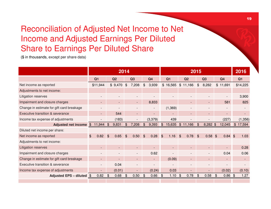 18 EBITDA and Adjusted EBITDA Reconciliation to Net Income ?? 2014 2015 2016 Q1 Q2 Q3 Q4 Q1 Q2 Q3 Q4 Q1 Net income as reported $11,944 $9,470 $ 7,208 $3,939 $16,565 $11,166 $8,282 $11,691 $14,225 Adjustments to net income: Income tax expense 4,424 3,521 1,032 321 6,220 4,410 2,325 2,577 4,312 Interest expense, net 689 619 927 720 1,088 805 777 959 1,655 Depreciation and amortization 18,886 14,120 15,209 16,364 23,003 17,260 18,618 18,493 23,951 Non-cash stock-based compensation 1,009 1,021 1,178 959 1,446 1,403 1,194 681 2,090 EBITDA $36,952 $28,751 $25,554 $22,303 $48,322 $35,044 $31,196 $34,401 $46,233 Litigation reserves - - - - - - - - 3,900 Impairment and closure charges - - - 8,833 - - - 581 825 Change in estimate for gift card breakage - - - - (1,369) - - - - Executive transition costs - 544 - - - - - - - Adjusted EBITDA $36,952 $29,295 $25,554 $31,136 $46,953 $35,044 $31,196 $34,982 $50,958 ($ in thousands)