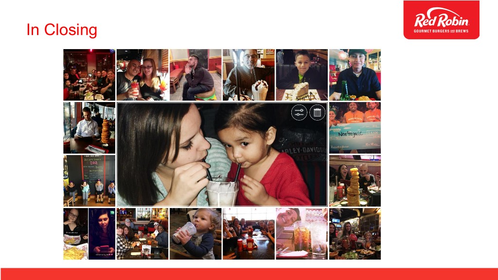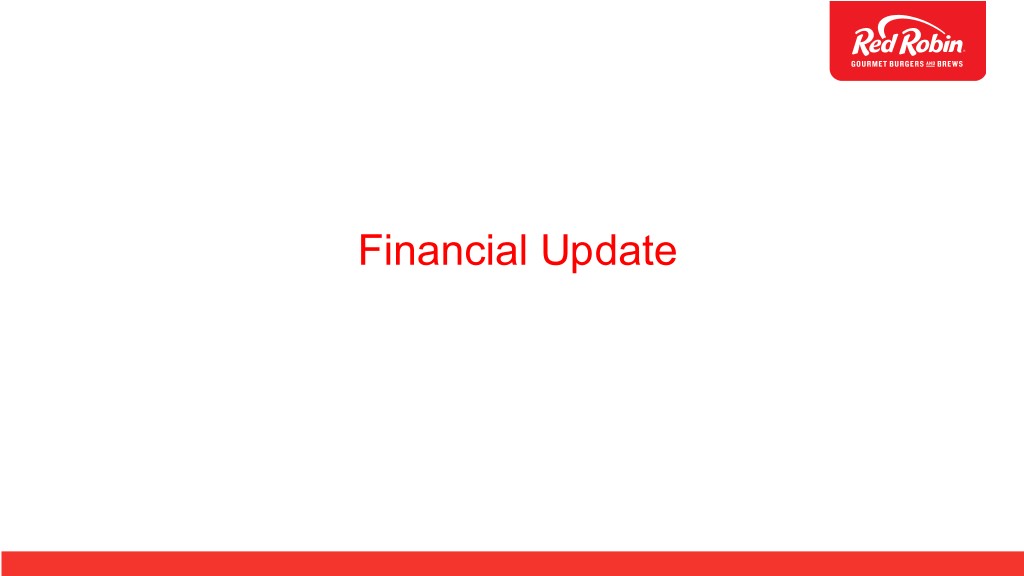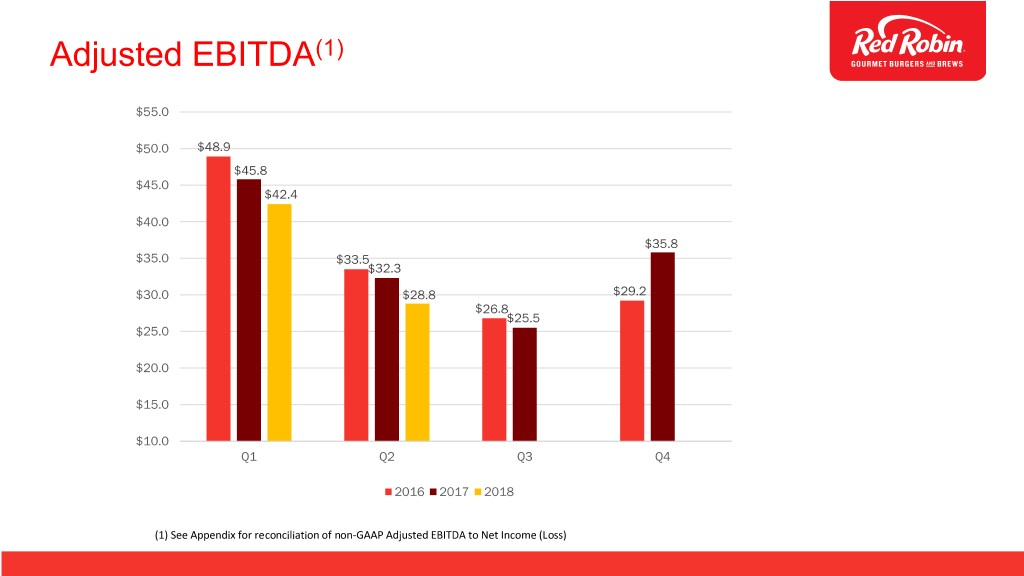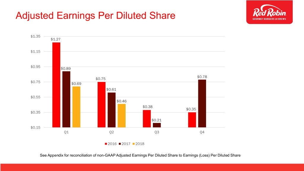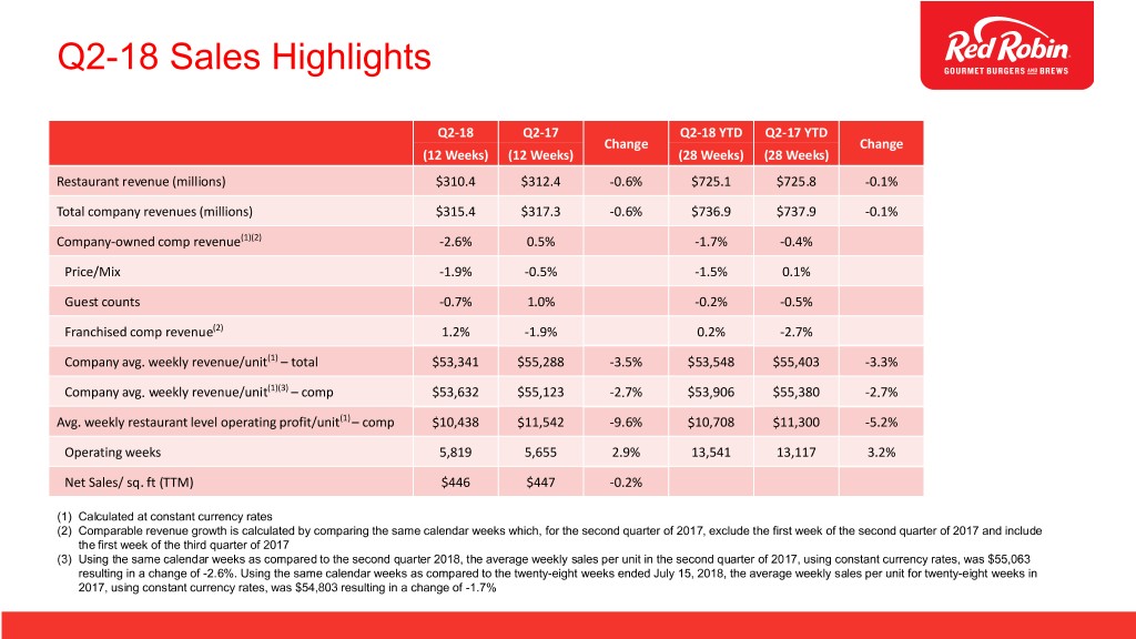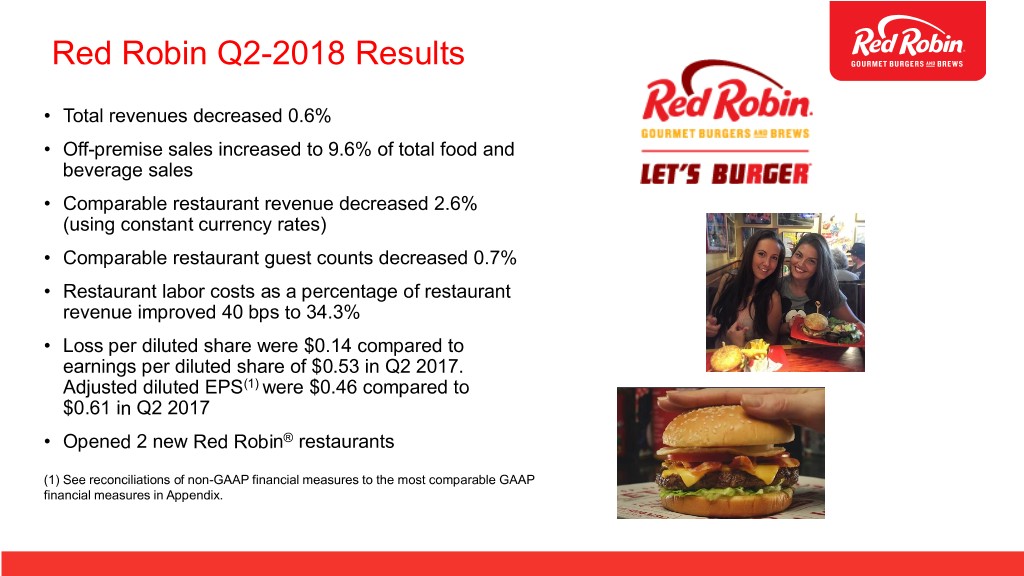 Red Robin Q2-2018 Results • Total revenues decreased 0.6% • Off-premise sales increased to 9.6% of total food and beverage sales • Comparable restaurant revenue decreased 2.6% (using constant currency rates) • Comparable restaurant guest counts decreased 0.7% • Restaurant labor costs as a percentage of restaurant revenue improved 40 bps to 34.3% • Loss per diluted share were $0.14 compared to earnings per diluted share of $0.53 in Q2 2017. Adjusted diluted EPS(1) were $0.46 compared to $0.61 in Q2 2017 • Opened 2 new Red Robin® restaurants (1) See reconciliations of non-GAAP financial measures to the most comparable GAAP financial measures in Appendix.