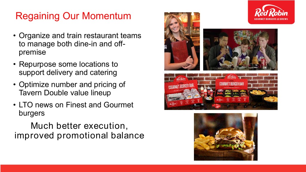 Regaining Our Momentum • Organize and train restaurant teams to manage both dine-in and off- premise • Repurpose some locations to support delivery and catering • Optimize number and pricing of Tavern Double value lineup • LTO news on Finest and Gourmet burgers Much better execution, improved promotional balance