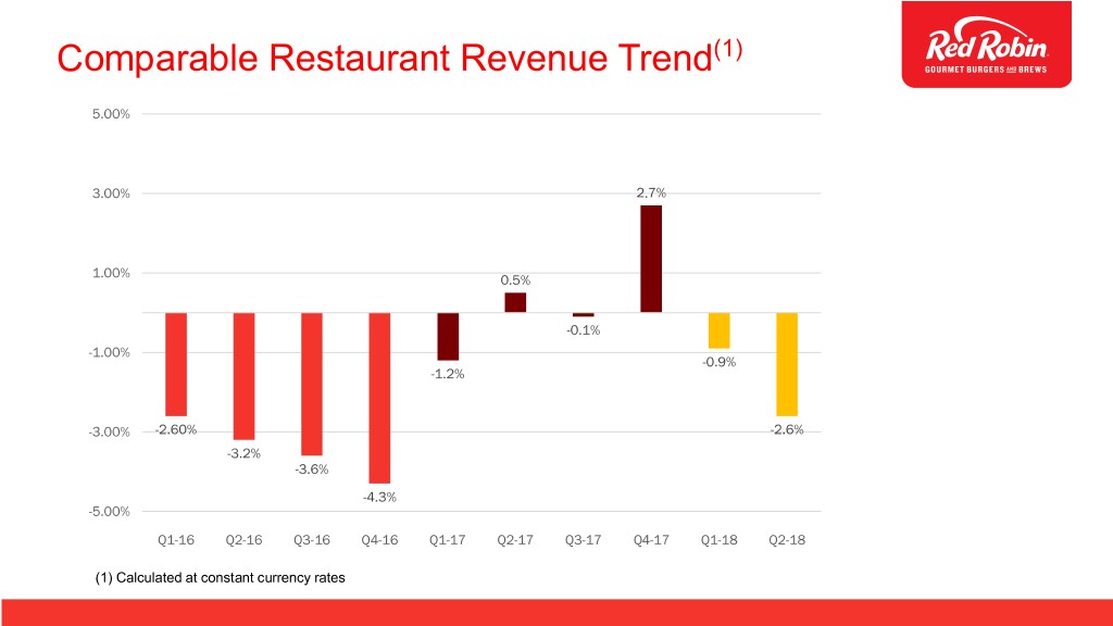 Comparable Restaurant Revenue Trend(1) 5.00% 3.00% 2.7% 1.00% 0.5% -0.1% -1.00% -0.9% -1.2% -3.00% -2.60% -2.6% -3.2% -3.6% -4.3% -5.00% Q1-16 Q2-16 Q3-16 Q4-16 Q1-17 Q2-17 Q3-17 Q4-17 Q1-18 Q2-18 (1) Calculated at constant currency rates