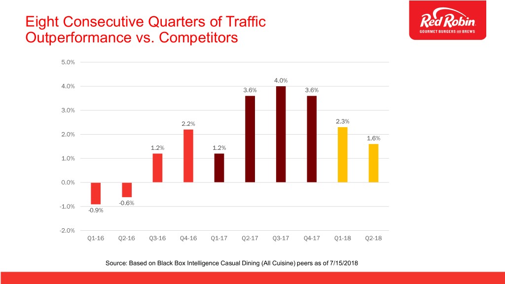 Eight Consecutive Quarters of Traffic Outperformance vs. Competitors 5.0% 4.0% 4.0% 3.6% 3.6% 3.0% 2.2% 2.3% 2.0% 1.6% 1.2% 1.2% 1.0% 0.0% -0.6% -1.0% -0.9% -2.0% Q1-16 Q2-16 Q3-16 Q4-16 Q1-17 Q2-17 Q3-17 Q4-17 Q1-18 Q2-18 Source: Based on Black Box Intelligence Casual Dining (All Cuisine) peers as of 7/15/2018