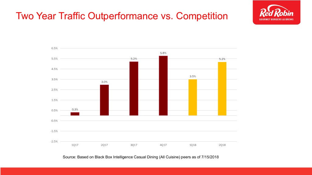 Two Year Traffic Outperformance vs. Competition 6.5% 5.8% 5.5% 5.2% 5.2% 4.5% 3.5% 3.5% 3.0% 2.5% 1.5% 0.5% 0.3% -0.5% -1.5% -2.5% 1Q17 2Q17 3Q17 4Q17 1Q18 2Q18 Source: Based on Black Box Intelligence Casual Dining (All Cuisine) peers as of 7/15/2018