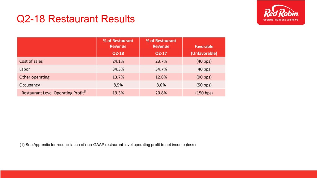 Q2-18 Restaurant Results % of Restaurant % of Restaurant Revenue Revenue Favorable Q2-18 Q2-17 (Unfavorable) Cost of sales 24.1% 23.7% (40 bps) Labor 34.3% 34.7% 40 bps Other operating 13.7% 12.8% (90 bps) Occupancy 8.5% 8.0% (50 bps) Restaurant Level Operating Profit(1) 19.3% 20.8% (150 bps) (1) See Appendix for reconciliation of non-GAAP restaurant-level operating profit to net income (loss)