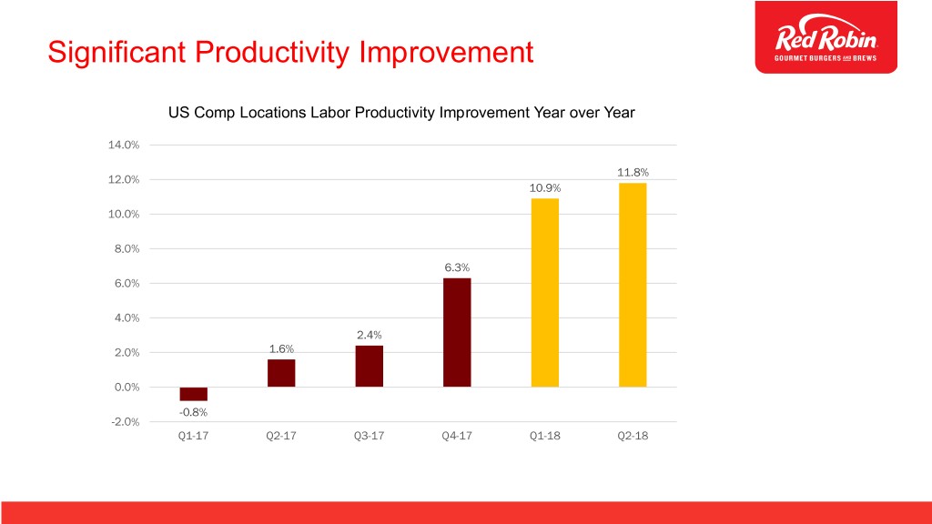 Significant Productivity Improvement US Comp Locations Labor Productivity Improvement Year over Year 14.0% 11.8% 12.0% 10.9% 10.0% 8.0% 6.3% 6.0% 4.0% 2.4% 2.0% 1.6% 0.0% -0.8% -2.0% Q1-17 Q2-17 Q3-17 Q4-17 Q1-18 Q2-18