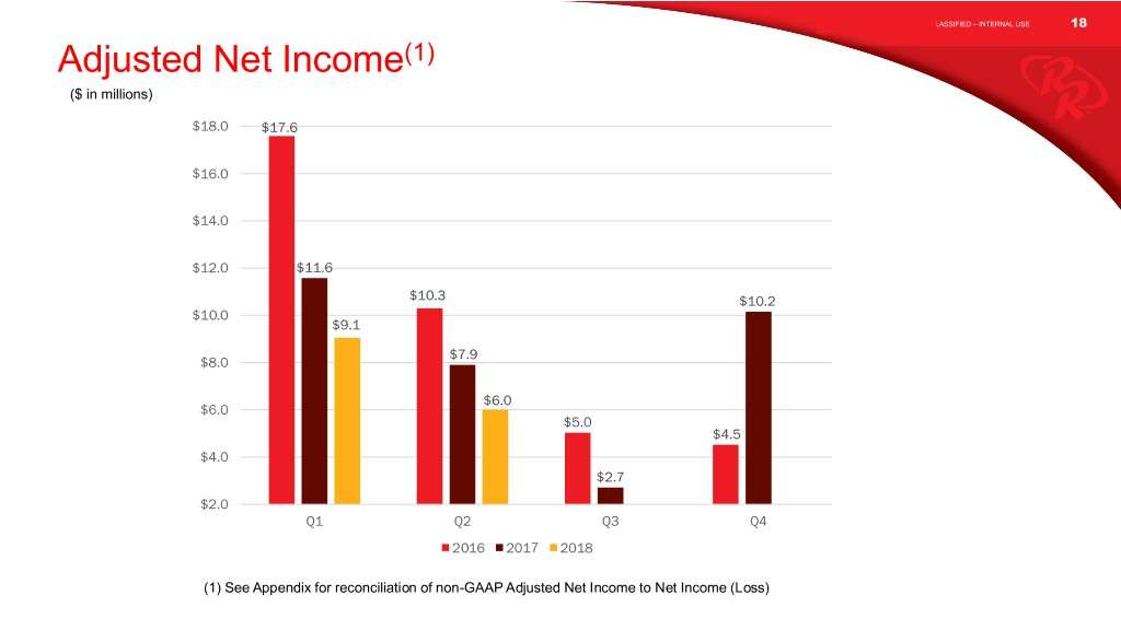 Adjusted EBITDA(1) $55.0 $50.0 $48.9 $45.8 $45.0 $42.4 $40.0 $35.8 $35.0 $33.5 $32.3 $30.0 $28.8 $29.2 $26.8 $25.5 $25.0 $20.0 $15.0 $10.0 Q1 Q2 Q3 Q4 2016 2017 2018 (1) See Appendix for reconciliation of non-GAAP Adjusted EBITDA to Net Income (Loss)