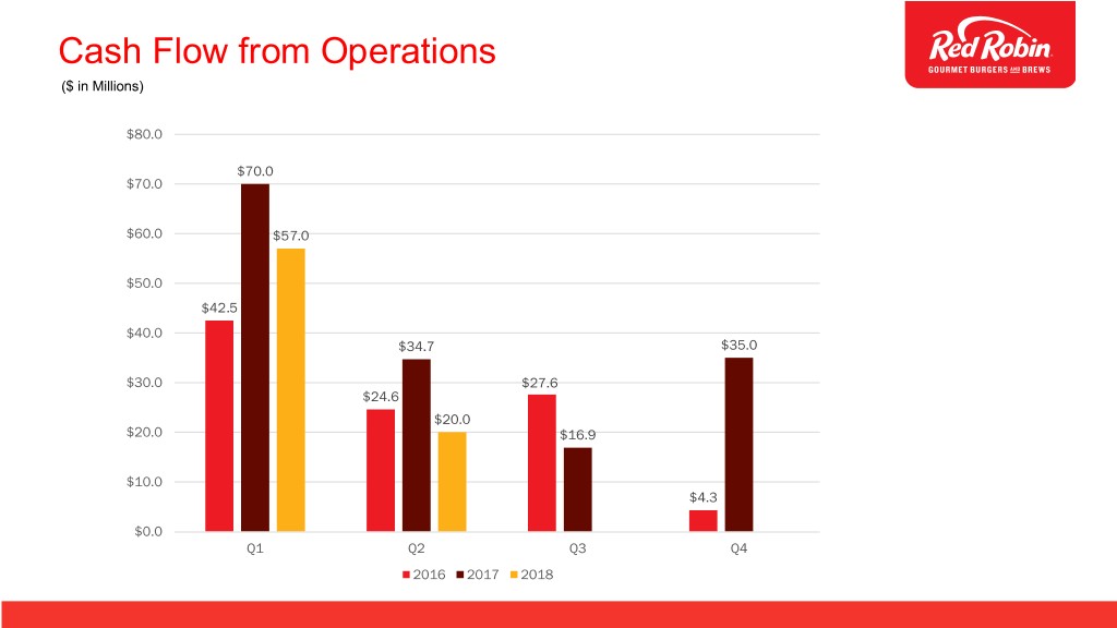 Cash Flow from Operations ($ in Millions) $80.0 $70.0 $70.0 $60.0 $57.0 $50.0 $42.5 $40.0 $34.7 $35.0 $30.0 $27.6 $24.6 $20.0 $20.0 $16.9 $10.0 $4.3 $0.0 Q1 Q2 Q3 Q4 2016 2017 2018