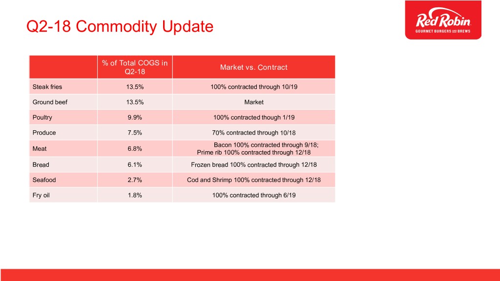 Q2-18 Commodity Update % of Total COGS in Market vs. Contract Q2-18 Steak fries 13.5% 100% contracted through 10/19 Ground beef 13.5% Market Poultry 9.9% 100% contracted though 1/19 Produce 7.5% 70% contracted through 10/18 Bacon 100% contracted through 9/18; Meat 6.8% Prime rib 100% contracted through 12/18 Bread 6.1% Frozen bread 100% contracted through 12/18 Seafood 2.7% Cod and Shrimp 100% contracted through 12/18 Fry oil 1.8% 100% contracted through 6/19