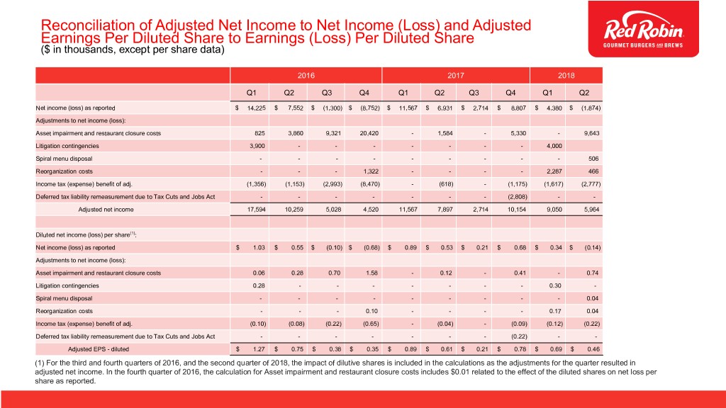Reconciliation of Adjusted Net Income to Net Income (Loss) and Adjusted Earnings Per Diluted Share to Earnings (Loss) Per Diluted Share ($ in thousands, except per share data) 2016 2017 2018 Q1 Q2 Q3 Q4 Q1 Q2 Q3 Q4 Q1 Q2 Net income (loss) as reported $ 14,225 $ 7,552 $ (1,300) $ (8,752) $ 11,567 $ 6,931 $ 2,714 $ 8,807 $ 4,380 $ (1,874) Adjustments to net income (loss): Asset impairment and restaurant closure costs 825 3,860 9,321 20,420 - 1,584 - 5,330 - 9,643 Litigation contingencies 3,900 - - - - - - - 4,000 Spiral menu disposal - - - - - - - - - 506 Reorganization costs - - - 1,322 - - - - 2,287 466 Income tax (expense) benefit of adj. (1,356) (1,153) (2,993) (8,470) - (618) - (1,175) (1,617) (2,777) Deferred tax liability remeasurement due to Tax Cuts and Jobs Act - - - - - - - (2,808) - - Adjusted net income 17,594 10,259 5,028 4,520 11,567 7,897 2,714 10,154 9,050 5,964 Diluted net income (loss) per share(1): Net income (loss) as reported $ 1.03 $ 0.55 $ (0.10) $ (0.68) $ 0.89 $ 0.53 $ 0.21 $ 0.68 $ 0.34 $ (0.14) Adjustments to net income (loss): Asset impairment and restaurant closure costs 0.06 0.28 0.70 1.58 - 0.12 - 0.41 - 0.74 Litigation contingencies 0.28 - - - - - - - 0.30 - Spiral menu disposal - - - - - - - - - 0.04 Reorganization costs - - - 0.10 - - - - 0.17 0.04 Income tax (expense) benefit of adj. (0.10) (0.08) (0.22) (0.65) - (0.04) - (0.09) (0.12) (0.22) Deferred tax liability remeasurement due to Tax Cuts and Jobs Act - - - - - - - (0.22) - - Adjusted EPS - diluted $ 1.27 $ 0.75 $ 0.38 $ 0.35 $ 0.89 $ 0.61 $ 0.21 $ 0.78 $ 0.69 $ 0.46 (1) For the third and fourth quarters of 2016, and the second quarter of 2018, the impact of dilutive shares is included in the calculations as the adjustments for the quarter resulted in adjusted net income. In the fourth quarter of 2016, the calculation for Asset impairment and restaurant closure costs includes $0.01 related to the effect of the diluted shares on net loss per share as reported.