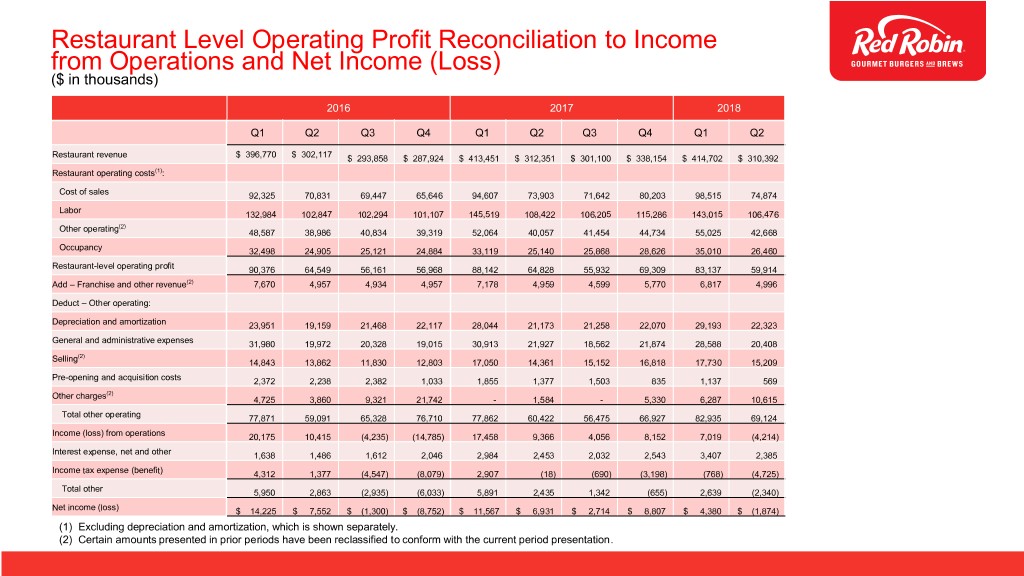 Restaurant Level Operating Profit Reconciliation to Income from Operations and Net Income (Loss) ($ in thousands) 2016 2017 2018 Q1 Q2 Q3 Q4 Q1 Q2 Q3 Q4 Q1 Q2 Restaurant revenue $ 396,770 $ 302,117 $ 293,858 $ 287,924 $ 413,451 $ 312,351 $ 301,100 $ 338,154 $ 414,702 $ 310,392 Restaurant operating costs(1): Cost of sales 92,325 70,831 69,447 65,646 94,607 73,903 71,642 80,203 98,515 74,874 Labor 132,984 102,847 102,294 101,107 145,519 108,422 106,205 115,286 143,015 106,476 (2) Other operating 48,587 38,986 40,834 39,319 52,064 40,057 41,454 44,734 55,025 42,668 Occupancy 32,498 24,905 25,121 24,884 33,119 25,140 25,868 28,626 35,010 26,460 Restaurant-level operating profit 90,376 64,549 56,161 56,968 88,142 64,828 55,932 69,309 83,137 59,914 Add – Franchise and other revenue(2) 7,670 4,957 4,934 4,957 7,178 4,959 4,599 5,770 6,817 4,996 Deduct – Other operating: Depreciation and amortization 23,951 19,159 21,468 22,117 28,044 21,173 21,258 22,070 29,193 22,323 General and administrative expenses 31,980 19,972 20,328 19,015 30,913 21,927 18,562 21,874 28,588 20,408 (2) Selling 14,843 13,862 11,830 12,803 17,050 14,361 15,152 16,818 17,730 15,209 Pre-opening and acquisition costs 2,372 2,238 2,382 1,033 1,855 1,377 1,503 835 1,137 569 (2) Other charges 4,725 3,860 9,321 21,742 - 1,584 - 5,330 6,287 10,615 Total other operating 77,871 59,091 65,328 76,710 77,862 60,422 56,475 66,927 82,935 69,124 Income (loss) from operations 20,175 10,415 (4,235) (14,785) 17,458 9,366 4,056 8,152 7,019 (4,214) Interest expense, net and other 1,638 1,486 1,612 2,046 2,984 2,453 2,032 2,543 3,407 2,385 Income tax expense (benefit) 4,312 1,377 (4,547) (8,079) 2,907 (18) (690) (3,198) (768) (4,725) Total other 5,950 2,863 (2,935) (6,033) 5,891 2,435 1,342 (655) 2,639 (2,340) Net income (loss) $ 14,225 $ 7,552 $ (1,300) $ (8,752) $ 11,567 $ 6,931 $ 2,714 $ 8,807 $ 4,380 $ (1,874) (1) Excluding depreciation and amortization, which is shown separately. (2) Certain amounts presented in prior periods have been reclassified to conform with the current period presentation.