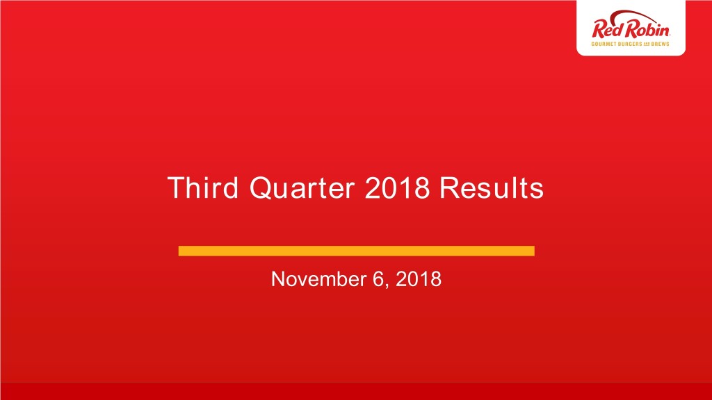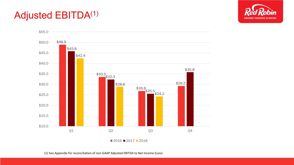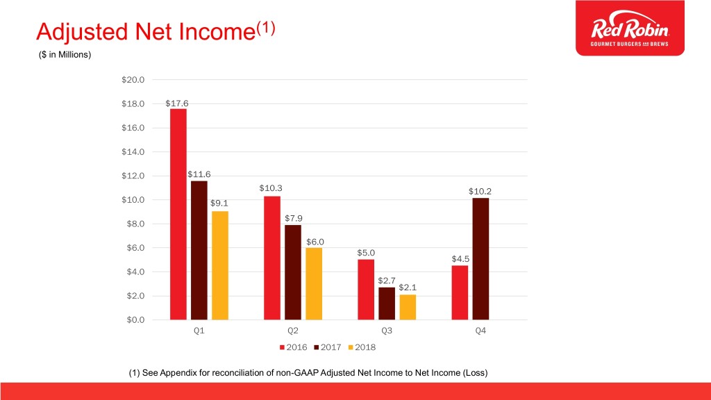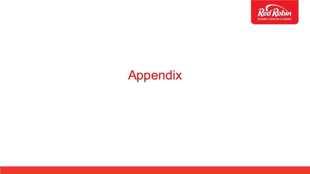 Red Robin Q3-2018 Results • Total revenues decreased 3.5% • Off-premise sales increased to 10.1% of total food and beverage sales • Comparable restaurant revenue decreased 3.4% (using constant currency rates) • Comparable restaurant guest counts decreased 1.9% • Restaurant labor costs as a percentage of restaurant revenue remained flat at 35.3% • Earnings per diluted share were $0.13 compared to earnings per diluted share of $0.21 in Q3 2017. Adjusted diluted EPS(1) were $0.16 compared to $0.21 in Q3 2017 • Opened 2 company-owned Red Robin® restaurants and 1 franchised Red Robin® restaurant (1) See reconciliations of non-GAAP financial measures to the most comparable GAAP financial measures in Appendix.