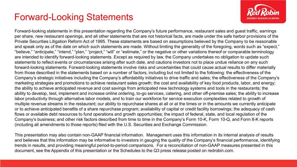 Forward-Looking Statements Forward-looking statements in this presentation regarding the Company’s future performance, restaurant sales and guest traffic, earnings per share, new restaurant openings, and all other statements that are not historical facts, are made under the safe harbor provisions of the Private Securities Litigation Reform Act of 1995. These statements are based on assumptions believed by the Company to be reasonable and speak only as of the date on which such statements are made. Without limiting the generality of the foregoing, words such as “expect,” “believe,” “anticipate,” “intend,” “plan,” “project,” “will” or “estimate,” or the negative or other variations thereof or comparable terminology are intended to identify forward-looking statements. Except as required by law, the Company undertakes no obligation to update such statements to reflect events or circumstances arising after such date, and cautions investors not to place undue reliance on any such forward-looking statements. Forward-looking statements involve risks and uncertainties that could cause actual results to differ materially from those described in the statements based on a number of factors, including but not limited to the following: the effectiveness of the Company’s strategic initiatives including the Company’s affordability initiatives to drive traffic and sales; the effectiveness of the Company’s marketing strategies and promotions to achieve restaurant sales growth; the cost and availability of key food products, labor, and energy; the ability to achieve anticipated revenue and cost savings from anticipated new technology systems and tools in the restaurants; the ability to develop, test, implement and increase online ordering, to-go services, catering, and other off-premise sales; the ability to increase labor productivity through alternative labor models, and to train our workforce for service execution complexities related to growth of multiple revenue streams in the restaurant; our ability to repurchase shares at all or at the times or in the amounts we currently anticipate or to achieve anticipated benefits of a share repurchase program; availability of capital or credit facility borrowings; the adequacy of cash flows or available debt resources to fund operations and growth opportunities; the impact of federal, state, and local regulation of the Company’s business; and other risk factors described from time to time in the Company’s Form 10-K, Form 10-Q, and Form 8-K reports (including all amendments to those reports) filed with the U.S. Securities and Exchange Commission. This presentation may also contain non-GAAP financial information. Management uses this information in its internal analysis of results and believes that this information may be informative to investors in gauging the quality of the Company’s financial performance, identifying trends in results, and providing meaningful period-to-period comparisons. For a reconciliation of non-GAAP measures presented in this document, see the Appendix of this presentation or the Schedules to the Q3 press release posted on redrobin.com.
