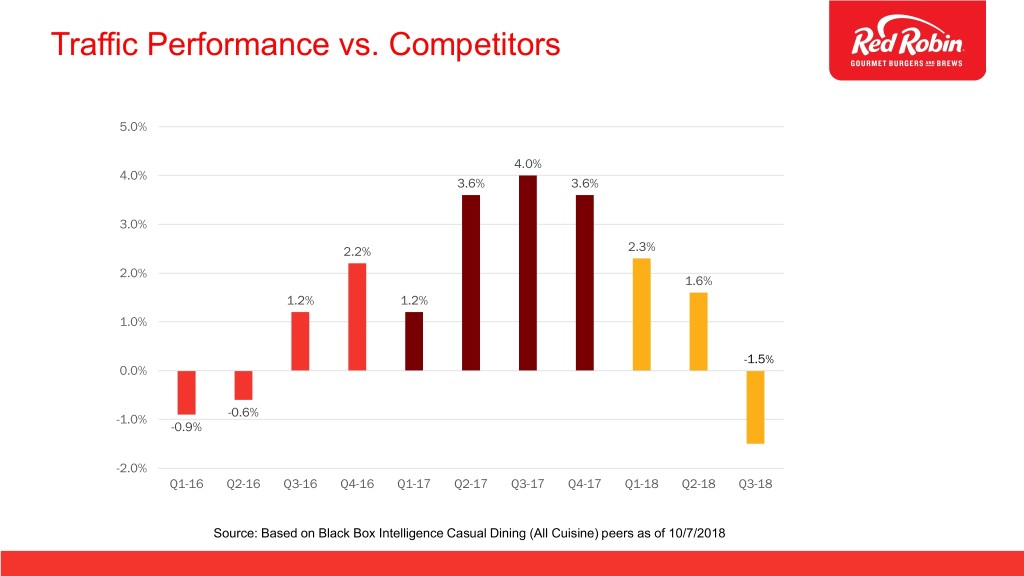 Traffic Performance vs. Competitors 5.0% 4.0% 4.0% 3.6% 3.6% 3.0% 2.2% 2.3% 2.0% 1.6% 1.2% 1.2% 1.0% -1.5% 0.0% -0.6% -1.0% -0.9% -2.0% Q1-16 Q2-16 Q3-16 Q4-16 Q1-17 Q2-17 Q3-17 Q4-17 Q1-18 Q2-18 Q3-18 Source: Based on Black Box Intelligence Casual Dining (All Cuisine) peers as of 10/7/2018