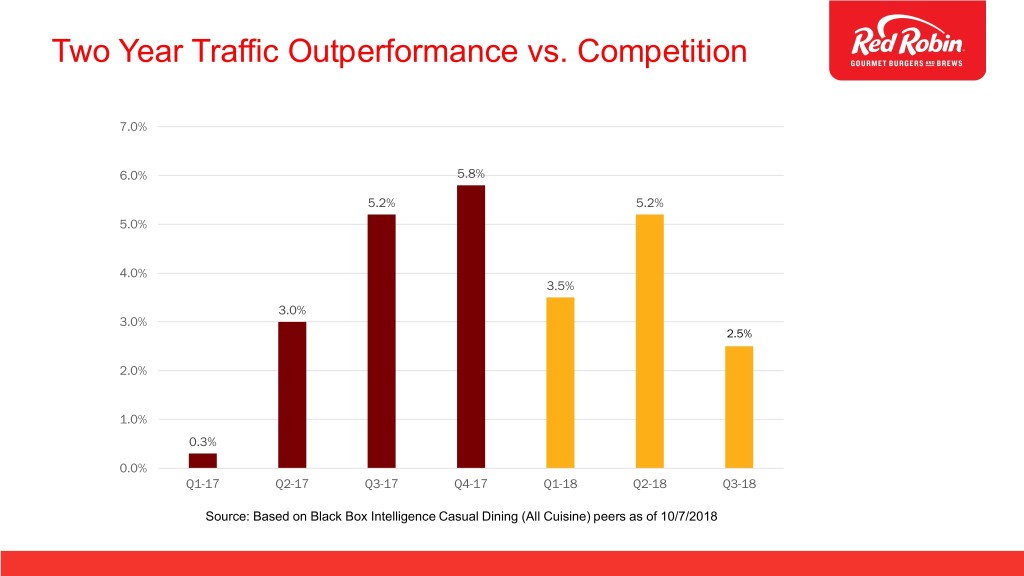 Two Year Traffic Outperformance vs. Competition 7.0% 6.0% 5.8% 5.2% 5.2% 5.0% 4.0% 3.5% 3.0% 3.0% 2.5% 2.0% 1.0% 0.3% 0.0% Q1-17 Q2-17 Q3-17 Q4-17 Q1-18 Q2-18 Q3-18 Source: Based on Black Box Intelligence Casual Dining (All Cuisine) peers as of 10/7/2018