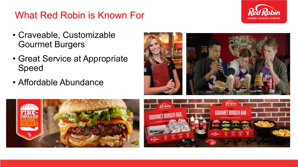 What Red Robin is Known For • Craveable, Customizable Gourmet Burgers • Great Service at Appropriate Speed • Affordable Abundance