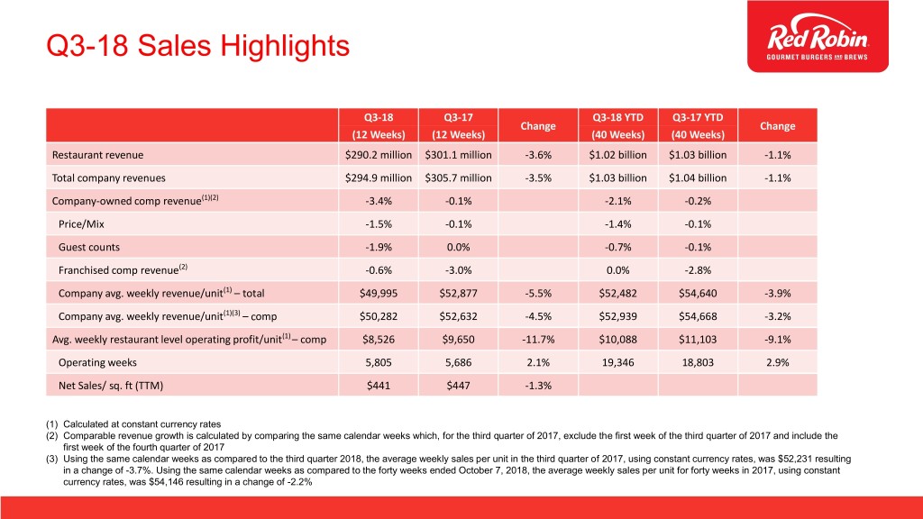 Q3-18 Sales Highlights Q3-18 Q3-17 Q3-18 YTD Q3-17 YTD Change Change (12 Weeks) (12 Weeks) (40 Weeks) (40 Weeks) Restaurant revenue $290.2 million $301.1 million -3.6% $1.02 billion $1.03 billion -1.1% Total company revenues $294.9 million $305.7 million -3.5% $1.03 billion $1.04 billion -1.1% Company-owned comp revenue(1)(2) -3.4% -0.1% -2.1% -0.2% Price/Mix -1.5% -0.1% -1.4% -0.1% Guest counts -1.9% 0.0% -0.7% -0.1% Franchised comp revenue(2) -0.6% -3.0% 0.0% -2.8% Company avg. weekly revenue/unit(1) – total $49,995 $52,877 -5.5% $52,482 $54,640 -3.9% Company avg. weekly revenue/unit(1)(3) – comp $50,282 $52,632 -4.5% $52,939 $54,668 -3.2% Avg. weekly restaurant level operating profit/unit(1) – comp $8,526 $9,650 -11.7% $10,088 $11,103 -9.1% Operating weeks 5,805 5,686 2.1% 19,346 18,803 2.9% Net Sales/ sq. ft (TTM) $441 $447 -1.3% (1) Calculated at constant currency rates (2) Comparable revenue growth is calculated by comparing the same calendar weeks which, for the third quarter of 2017, exclude the first week of the third quarter of 2017 and include the first week of the fourth quarter of 2017 (3) Using the same calendar weeks as compared to the third quarter 2018, the average weekly sales per unit in the third quarter of 2017, using constant currency rates, was $52,231 resulting in a change of -3.7%. Using the same calendar weeks as compared to the forty weeks ended October 7, 2018, the average weekly sales per unit for forty weeks in 2017, using constant currency rates, was $54,146 resulting in a change of -2.2%