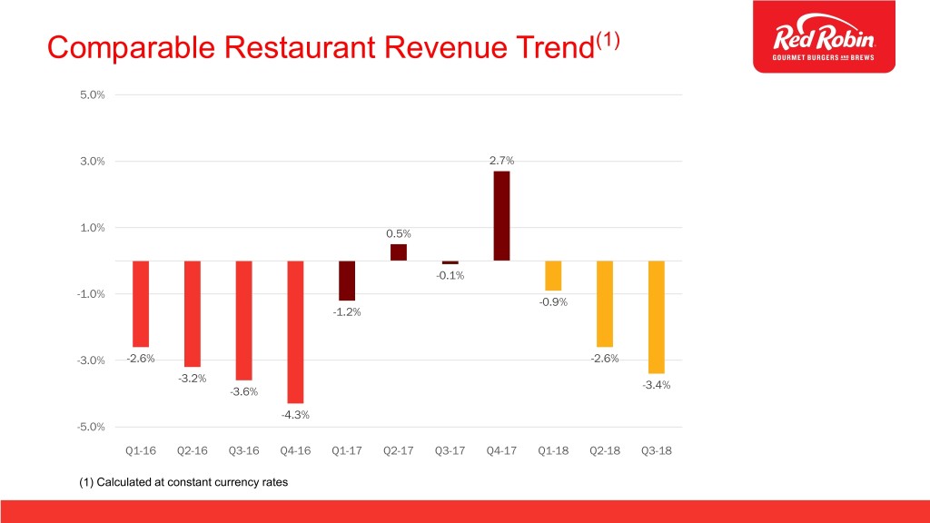 Comparable Restaurant Revenue Trend(1) 5.0% 3.0% 2.7% 1.0% 0.5% -0.1% -1.0% -0.9% -1.2% -3.0% -2.6% -2.6% -3.2% -3.4% -3.6% -4.3% -5.0% Q1-16 Q2-16 Q3-16 Q4-16 Q1-17 Q2-17 Q3-17 Q4-17 Q1-18 Q2-18 Q3-18 (1) Calculated at constant currency rates