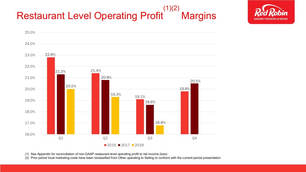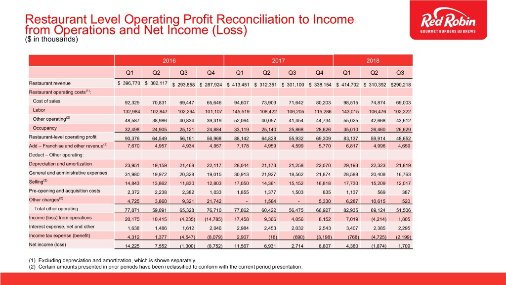 Restaurant Level Operating Profit Reconciliation to Income from Operations and Net Income (Loss) ($ in thousands) 2016 2017 2018 Q1 Q2 Q3 Q4 Q1 Q2 Q3 Q4 Q1 Q2 Q3 Restaurant revenue $ 396,770 $ 302,117 $ 293,858 $ 287,924 $ 413,451 $ 312,351 $ 301,100 $ 338,154 $ 414,702 $ 310,392 $290,218 Restaurant operating costs(1): Cost of sales 92,325 70,831 69,447 65,646 94,607 73,903 71,642 80,203 98,515 74,874 69,003 Labor 132,984 102,847 102,294 101,107 145,519 108,422 106,205 115,286 143,015 106,476 102,322 (2) Other operating 48,587 38,986 40,834 39,319 52,064 40,057 41,454 44,734 55,025 42,668 43,612 Occupancy 32,498 24,905 25,121 24,884 33,119 25,140 25,868 28,626 35,010 26,460 26,629 Restaurant-level operating profit 90,376 64,549 56,161 56,968 88,142 64,828 55,932 69,309 83,137 59,914 48,652 Add – Franchise and other revenue(2) 7,670 4,957 4,934 4,957 7,178 4,959 4,599 5,770 6,817 4,996 4,659 Deduct – Other operating: Depreciation and amortization 23,951 19,159 21,468 22,117 28,044 21,173 21,258 22,070 29,193 22,323 21,819 General and administrative expenses 31,980 19,972 20,328 19,015 30,913 21,927 18,562 21,874 28,588 20,408 16,763 (2) Selling 14,843 13,862 11,830 12,803 17,050 14,361 15,152 16,818 17,730 15,209 12,017 Pre-opening and acquisition costs 2,372 2,238 2,382 1,033 1,855 1,377 1,503 835 1,137 569 387 (2) Other charges 4,725 3,860 9,321 21,742 - 1,584 - 5,330 6,287 10,615 520 Total other operating 77,871 59,091 65,328 76,710 77,862 60,422 56,475 66,927 82,935 69,124 51,506 Income (loss) from operations 20,175 10,415 (4,235) (14,785) 17,458 9,366 4,056 8,152 7,019 (4,214) 1,805 Interest expense, net and other 1,638 1,486 1,612 2,046 2,984 2,453 2,032 2,543 3,407 2,385 2,295 Income tax expense (benefit) 4,312 1,377 (4,547) (8,079) 2,907 (18) (690) (3,198) (768) (4,725) (2,199) Net income (loss) 14,225 7,552 (1,300) (8,752) 11,567 6,931 2,714 8,807 4,380 (1,874) 1,709 (1) Excluding depreciation and amortization, which is shown separately. (2) Certain amounts presented in prior periods have been reclassified to conform with the current period presentation.