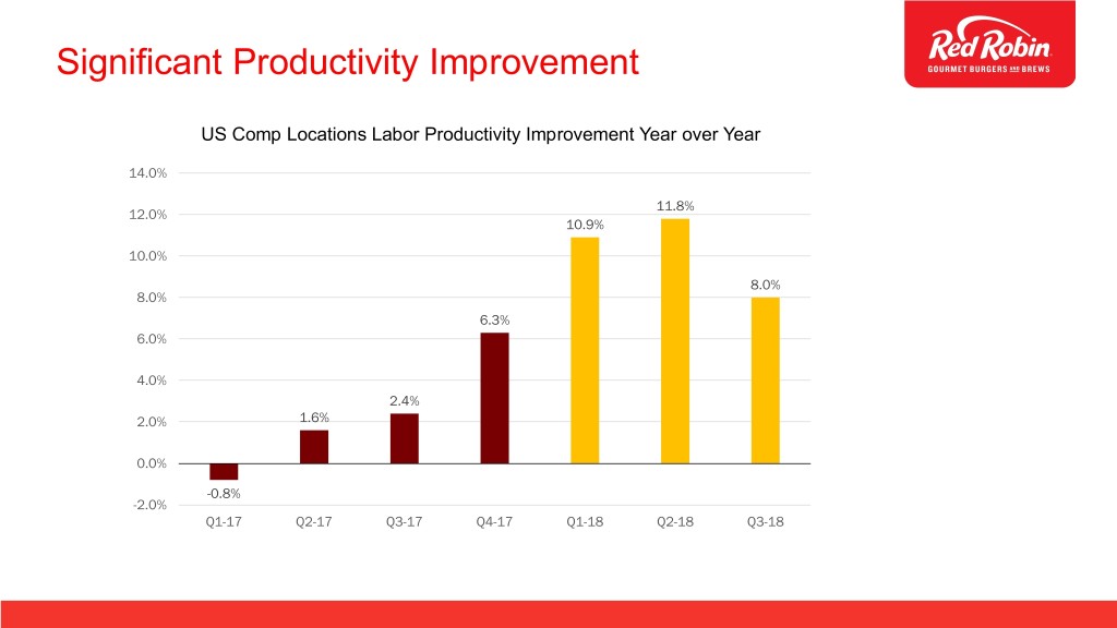Significant Productivity Improvement US Comp Locations Labor Productivity Improvement Year over Year 14.0% 11.8% 12.0% 10.9% 10.0% 8.0% 8.0% 6.3% 6.0% 4.0% 2.4% 2.0% 1.6% 0.0% -0.8% -2.0% Q1-17 Q2-17 Q3-17 Q4-17 Q1-18 Q2-18 Q3-18