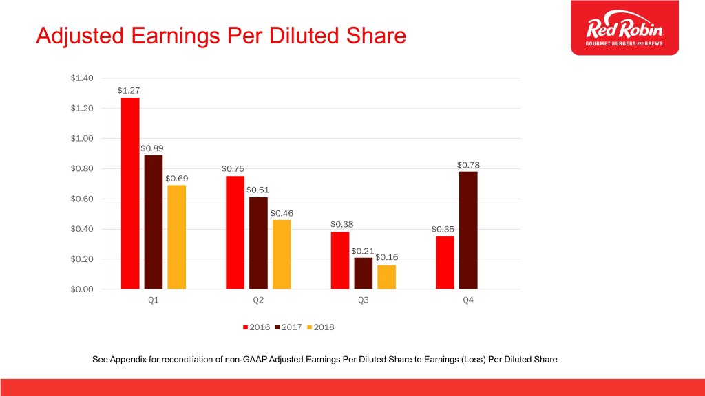 Reconciliation of Adjusted Net Income to Net Income (Loss) and Adjusted Earnings Per Diluted Share to Earnings (Loss) Per Diluted Share ($ in thousands, except per share data) 2016 2017 2018 Q1 Q2 Q3 Q4 Q1 Q2 Q3 Q4 Q1 Q2 Q3 Net income (loss) as reported $ 14,225 $ 7,552 $ (1,300) $ (8,752) $ 11,567 $ 6,931 $ 2,714 $ 8,807 $ 4,380 $ (1,874) $ 1,709 Adjustments to net income (loss): Asset impairment and restaurant closure costs 825 3,860 9,321 20,420 - 1,584 - 5,330 - 9,643 - Litigation contingencies 3,900 - - - - - - - 4,000 - Spiral menu disposal - - - - - - - - - 506 - Reorganization costs - - - 1,322 - - - - 2,287 466 520 Income tax (expense) benefit of adj. (1,356) (1,153) (2,993) (8,470) - (618) - (1,175) (1,617) (2,777) (135) Deferred tax liability remeasurement due to Tax Cuts and Jobs Act - - - - - - - (2,808) - - - Adjusted net income 17,594 10,259 5,028 4,520 11,567 7,897 2,714 10,154 9,050 5,964 2.094 Diluted net income (loss) per share(1): Net income (loss) as reported $ 1.03 $ 0.55 $ (0.10) $ (0.68) $ 0.89 $ 0.53 $ 0.21 $ 0.68 $ 0.34 $ (0.14) $ 0.13 Adjustments to net income (loss): Asset impairment and restaurant closure costs 0.06 0.28 0.70 1.58 - 0.12 - 0.41 - 0.74 - Litigation contingencies 0.28 - - - - - - - 0.30 - - Spiral menu disposal - - - - - - - - - 0.04 - Reorganization costs - - - 0.10 - - - - 0.17 0.04 0.04 Income tax (expense) benefit of adj. (0.10) (0.08) (0.22) (0.65) - (0.04) - (0.09) (0.12) (0.22) (0.01) Deferred tax liability remeasurement due to Tax Cuts and Jobs Act - - - - - - - (0.22) - - - Adjusted EPS - diluted $ 1.27 $ 0.75 $ 0.38 $ 0.35 $ 0.89 $ 0.61 $ 0.21 $ 0.78 $ 0.69 $ 0.46 $ 0.16 (1) For the third and fourth quarters of 2016, and the second quarter of 2018, the impact of dilutive shares is included in the calculations as the adjustments for the quarter resulted in adjusted net income. In the fourth quarter of 2016, the calculation for Asset impairment and restaurant closure costs includes $0.01 related to the effect of the diluted shares on net loss per share as reported.