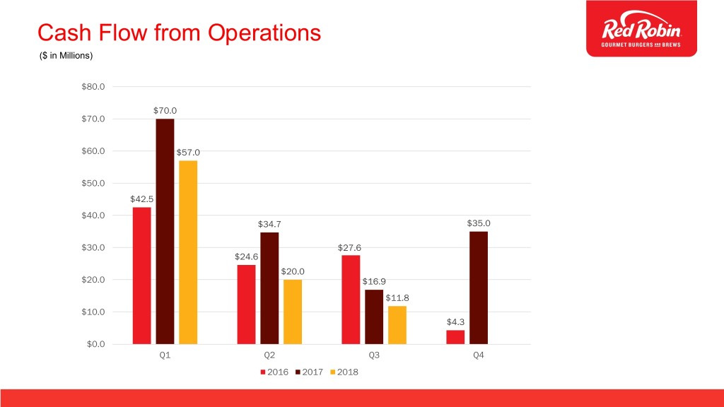 Cash Flow from Operations ($ in Millions) $80.0 $70.0 $70.0 $60.0 $57.0 $50.0 $42.5 $40.0 $34.7 $35.0 $30.0 $27.6 $24.6 $20.0 $20.0 $16.9 $11.8 $10.0 $4.3 $0.0 Q1 Q2 Q3 Q4 2016 2017 2018