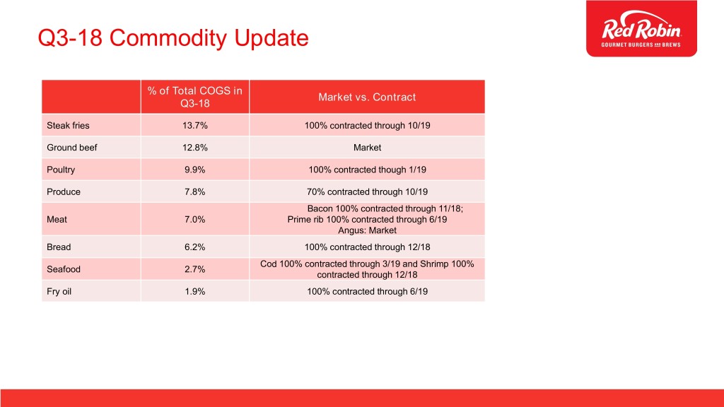 Q3-18 Commodity Update % of Total COGS in Market vs. Contract Q3-18 Steak fries 13.7% 100% contracted through 10/19 Ground beef 12.8% Market Poultry 9.9% 100% contracted though 1/19 Produce 7.8% 70% contracted through 10/19 Bacon 100% contracted through 11/18; Meat 7.0% Prime rib 100% contracted through 6/19 Angus: Market Bread 6.2% 100% contracted through 12/18 Cod 100% contracted through 3/19 and Shrimp 100% Seafood 2.7% contracted through 12/18 Fry oil 1.9% 100% contracted through 6/19
