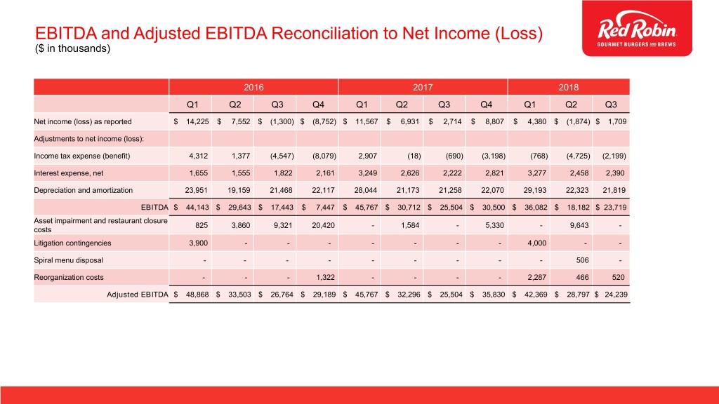 EBITDA and Adjusted EBITDA Reconciliation to Net Income (Loss) ($ in thousands) 2016 2017 2018 Q1 Q2 Q3 Q4 Q1 Q2 Q3 Q4 Q1 Q2 Q3 Net income (loss) as reported $ 14,225 $ 7,552 $ (1,300) $ (8,752) $ 11,567 $ 6,931 $ 2,714 $ 8,807 $ 4,380 $ (1,874) $ 1,709 Adjustments to net income (loss): Income tax expense (benefit) 4,312 1,377 (4,547) (8,079) 2,907 (18) (690) (3,198) (768) (4,725) (2,199) Interest expense, net 1,655 1,555 1,822 2,161 3,249 2,626 2,222 2,821 3,277 2,458 2,390 Depreciation and amortization 23,951 19,159 21,468 22,117 28,044 21,173 21,258 22,070 29,193 22,323 21,819 EBITDA $ 44,143 $ 29,643 $ 17,443 $ 7,447 $ 45,767 $ 30,712 $ 25,504 $ 30,500 $ 36,082 $ 18,182 $ 23,719 Asset impairment and restaurant closure 825 3,860 9,321 20,420 - 1,584 - 5,330 - 9,643 - costs Litigation contingencies 3,900 - - - - - - - 4,000 - - Spiral menu disposal - - - - - - - - - 506 - Reorganization costs - - - 1,322 - - - - 2,287 466 520 Adjusted EBITDA $ 48,868 $ 33,503 $ 26,764 $ 29,189 $ 45,767 $ 32,296 $ 25,504 $ 35,830 $ 42,369 $ 28,797 $ 24,239