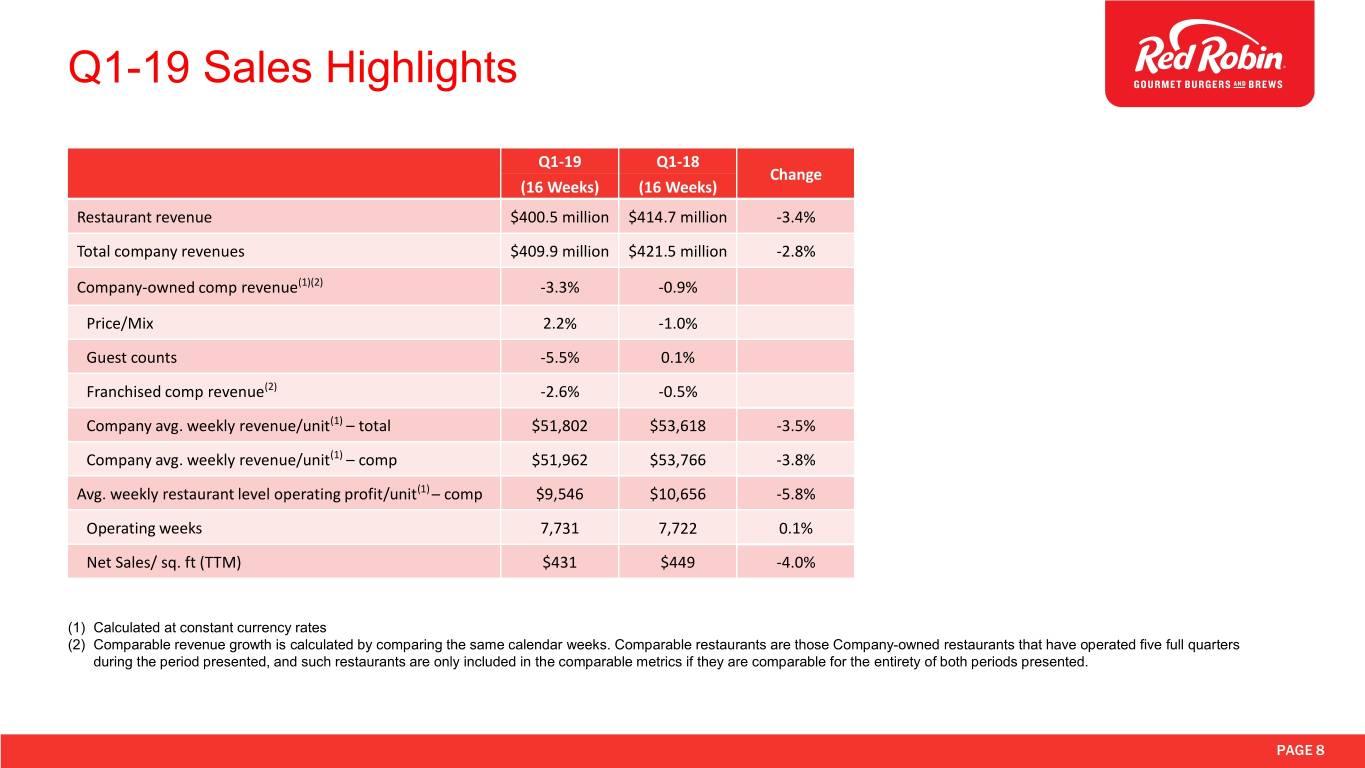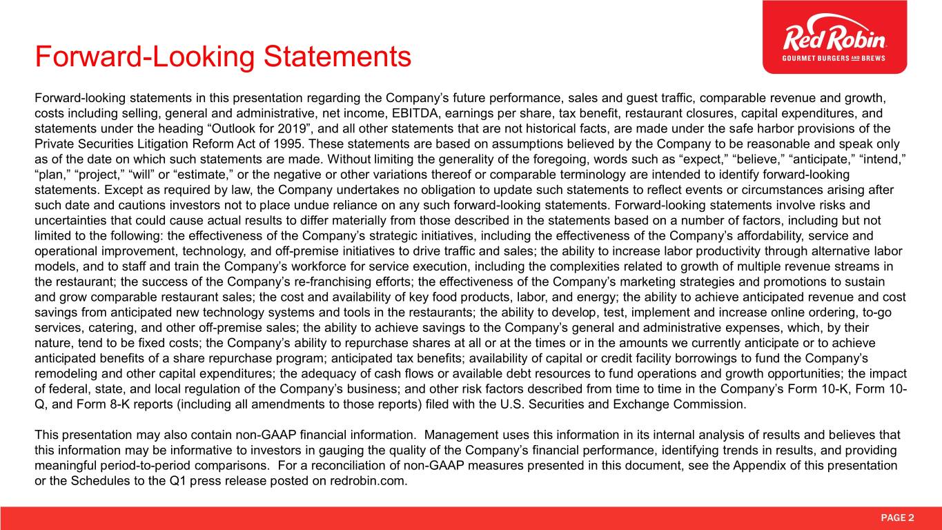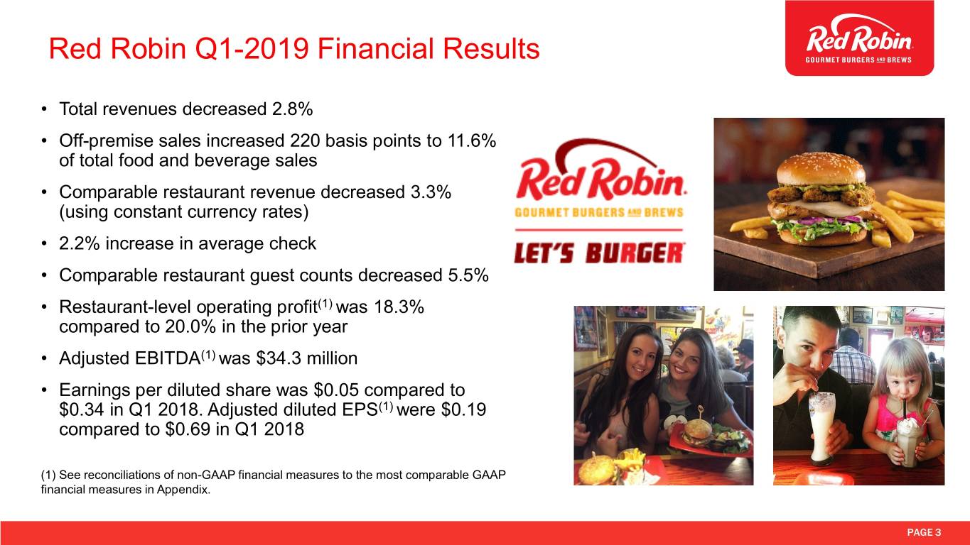 Forward-Looking Statements Forward-looking statements in this presentation regarding the Company’s future performance, sales and guest traffic, comparable revenue and growth, costs including selling, general and administrative, net income, EBITDA, earnings per share, tax benefit, restaurant closures, capital expenditures, and statements under the heading “Outlook for 2019”, and all other statements that are not historical facts, are made under the safe harbor provisions of the Private Securities Litigation Reform Act of 1995. These statements are based on assumptions believed by the Company to be reasonable and speak only as of the date on which such statements are made. Without limiting the generality of the foregoing, words such as “expect,” “believe,” “anticipate,” “intend,” “plan,” “project,” “will” or “estimate,” or the negative or other variations thereof or comparable terminology are intended to identify forward-looking statements. Except as required by law, the Company undertakes no obligation to update such statements to reflect events or circumstances arising after such date and cautions investors not to place undue reliance on any such forward-looking statements. Forward-looking statements involve risks and uncertainties that could cause actual results to differ materially from those described in the statements based on a number of factors, including but not limited to the following: the effectiveness of the Company’s strategic initiatives, including the effectiveness of the Company’s affordability, service and operational improvement, technology, and off-premise initiatives to drive traffic and sales; the ability to increase labor productivity through alternative labor models, and to staff and train the Company’s workforce for service execution, including the complexities related to growth of multiple revenue streams in the restaurant; the success of the Company’s re-franchising efforts; the effectiveness of the Company’s marketing strategies and promotions to sustain and grow comparable restaurant sales; the cost and availability of key food products, labor, and energy; the ability to achieve anticipated revenue and cost savings from anticipated new technology systems and tools in the restaurants; the ability to develop, test, implement and increase online ordering, to-go services, catering, and other off-premise sales; the ability to achieve savings to the Company’s general and administrative expenses, which, by their nature, tend to be fixed costs; the Company’s ability to repurchase shares at all or at the times or in the amounts we currently anticipate or to achieve anticipated benefits of a share repurchase program; anticipated tax benefits; availability of capital or credit facility borrowings to fund the Company’s remodeling and other capital expenditures; the adequacy of cash flows or available debt resources to fund operations and growth opportunities; the impact of federal, state, and local regulation of the Company’s business; and other risk factors described from time to time in the Company’s Form 10-K, Form 10- Q, and Form 8-K reports (including all amendments to those reports) filed with the U.S. Securities and Exchange Commission. This presentation may also contain non-GAAP financial information. Management uses this information in its internal analysis of results and believes that this information may be informative to investors in gauging the quality of the Company’s financial performance, identifying trends in results, and providing meaningful period-to-period comparisons. For a reconciliation of non-GAAP measures presented in this document, see the Appendix of this presentation or the Schedules to the Q1 press release posted on redrobin.com. PAGE 2
