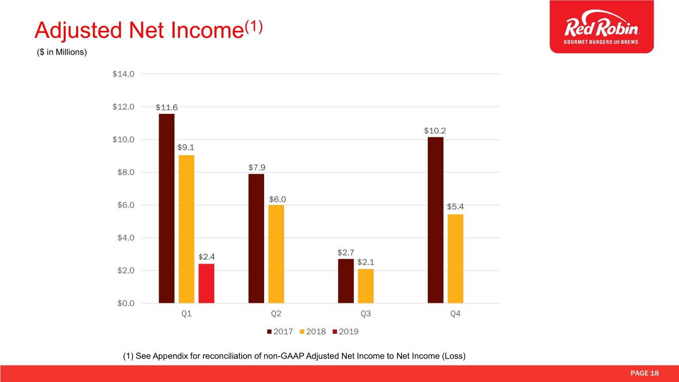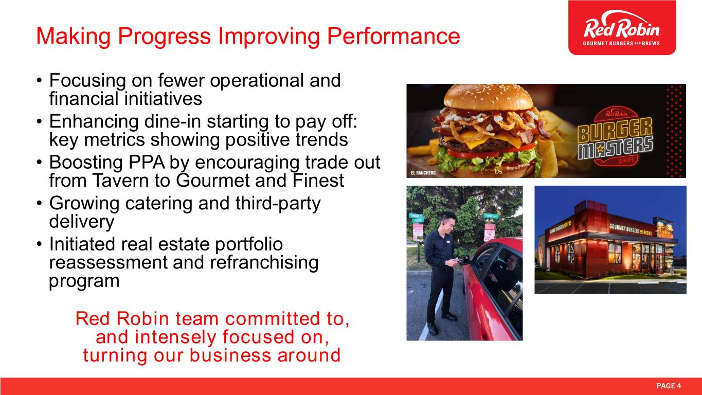 Red Robin Q1-2019 Financial Results • Total revenues decreased 2.8% • Off-premise sales increased 220 basis points to 11.6% of total food and beverage sales • Comparable restaurant revenue decreased 3.3% (using constant currency rates) • 2.2% increase in average check • Comparable restaurant guest counts decreased 5.5% • Restaurant-level operating profit(1) was 18.3% compared to 20.0% in the prior year • Adjusted EBITDA(1) was $34.3 million • Earnings per diluted share was $0.05 compared to $0.34 in Q1 2018. Adjusted diluted EPS(1) were $0.19 compared to $0.69 in Q1 2018 (1) See reconciliations of non-GAAP financial measures to the most comparable GAAP financial measures in Appendix. PAGE 3