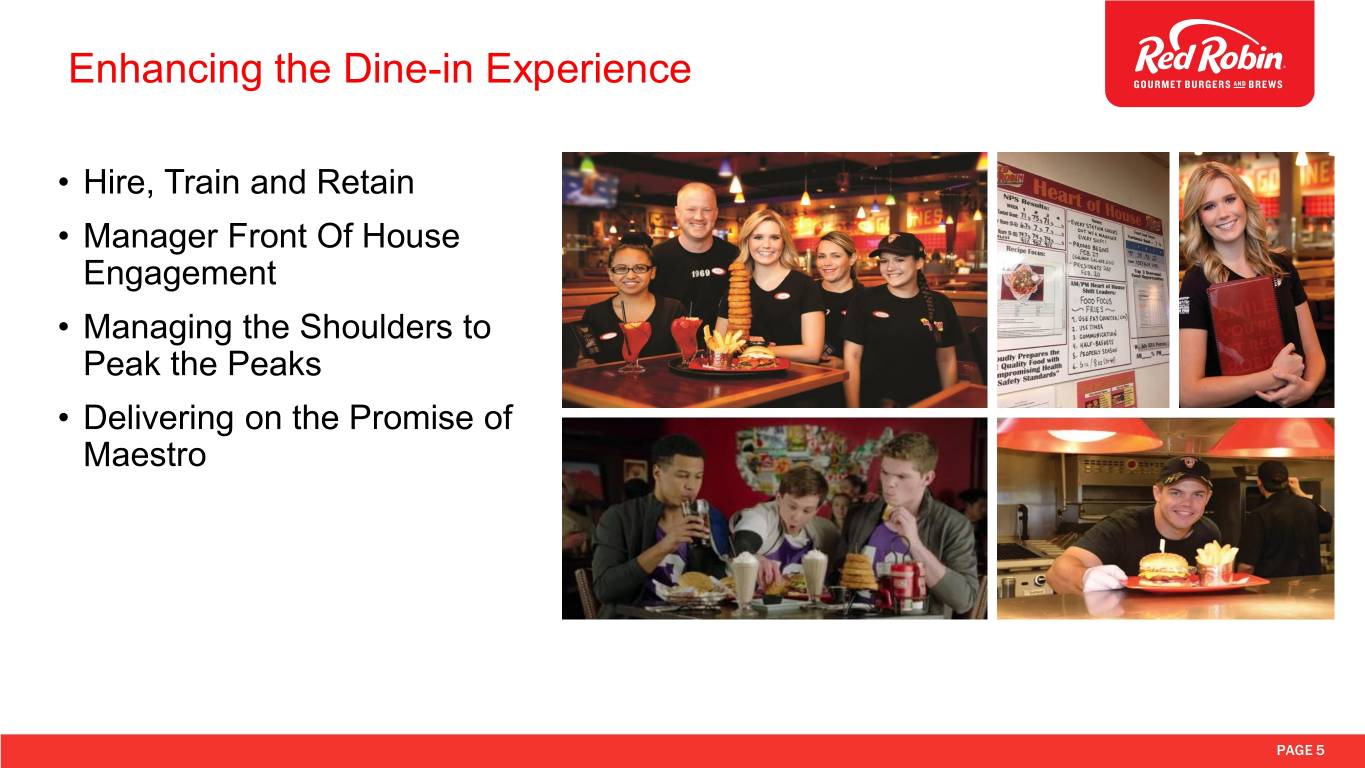 Making Progress Improving Performance • Focusing on fewer operational and financial initiatives • Enhancing dine-in starting to pay off: key metrics showing positive trends • Boosting PPA by encouraging trade out from Tavern to Gourmet and Finest • Growing catering and third-party delivery • Initiated real estate portfolio reassessment and refranchising program Red Robin team committed to, and intensely focused on, turning our business around PAGE 4