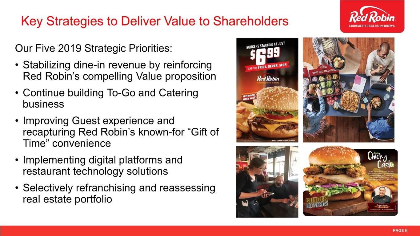 Key Strategies to Deliver Value to Shareholders Our Five 2019 Strategic Priorities: • Stabilizing dine-in revenue by reinforcing Red Robin’s compelling Value proposition • Continue building To-Go and Catering business • Improving Guest experience and recapturing Red Robin’s known-for “Gift of Time” convenience • Implementing digital platforms and restaurant technology solutions • Selectively refranchising and reassessing real estate portfolio PAGE 6