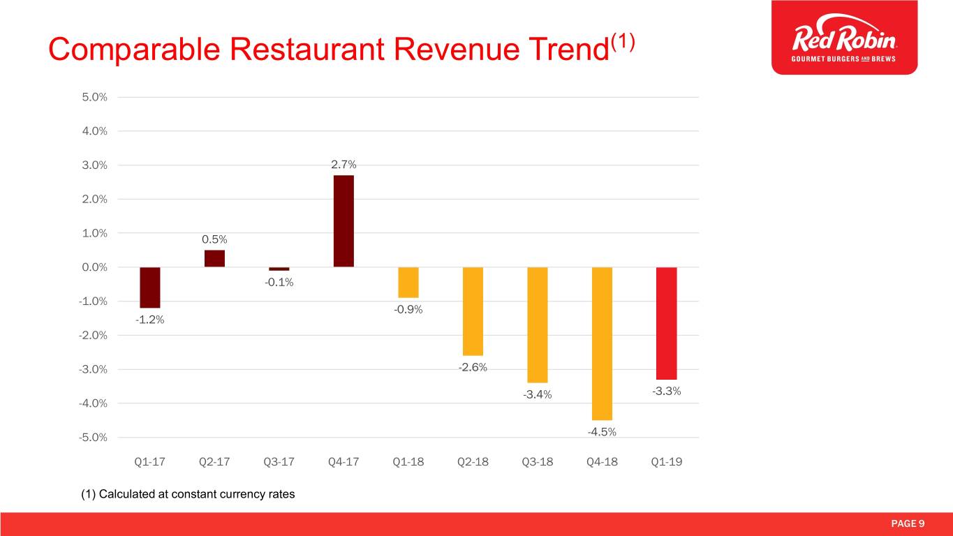 Q1-19 Sales Highlights Q1-19 Q1-18 Change (16 Weeks) (16 Weeks) Restaurant revenue $400.5 million $414.7 million -3.4% Total company revenues $409.9 million $421.5 million -2.8% Company-owned comp revenue(1)(2) -3.3% -0.9% Price/Mix 2.2% -1.0% Guest counts -5.5% 0.1% Franchised comp revenue(2) -2.6% -0.5% Company avg. weekly revenue/unit(1) – total $51,802 $53,618 -3.5% Company avg. weekly revenue/unit(1) – comp $51,962 $53,766 -3.8% Avg. weekly restaurant level operating profit/unit(1) – comp $9,546 $10,656 -5.8% Operating weeks 7,731 7,722 0.1% Net Sales/ sq. ft (TTM) $431 $449 -4.0% (1) Calculated at constant currency rates (2) Comparable revenue growth is calculated by comparing the same calendar weeks. Comparable restaurants are those Company-owned restaurants that have operated five full quarters during the period presented, and such restaurants are only included in the comparable metrics if they are comparable for the entirety of both periods presented. PAGE 8