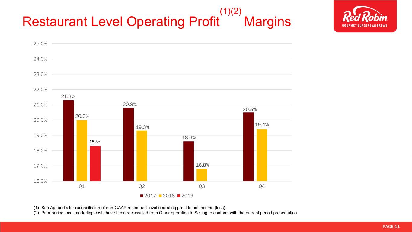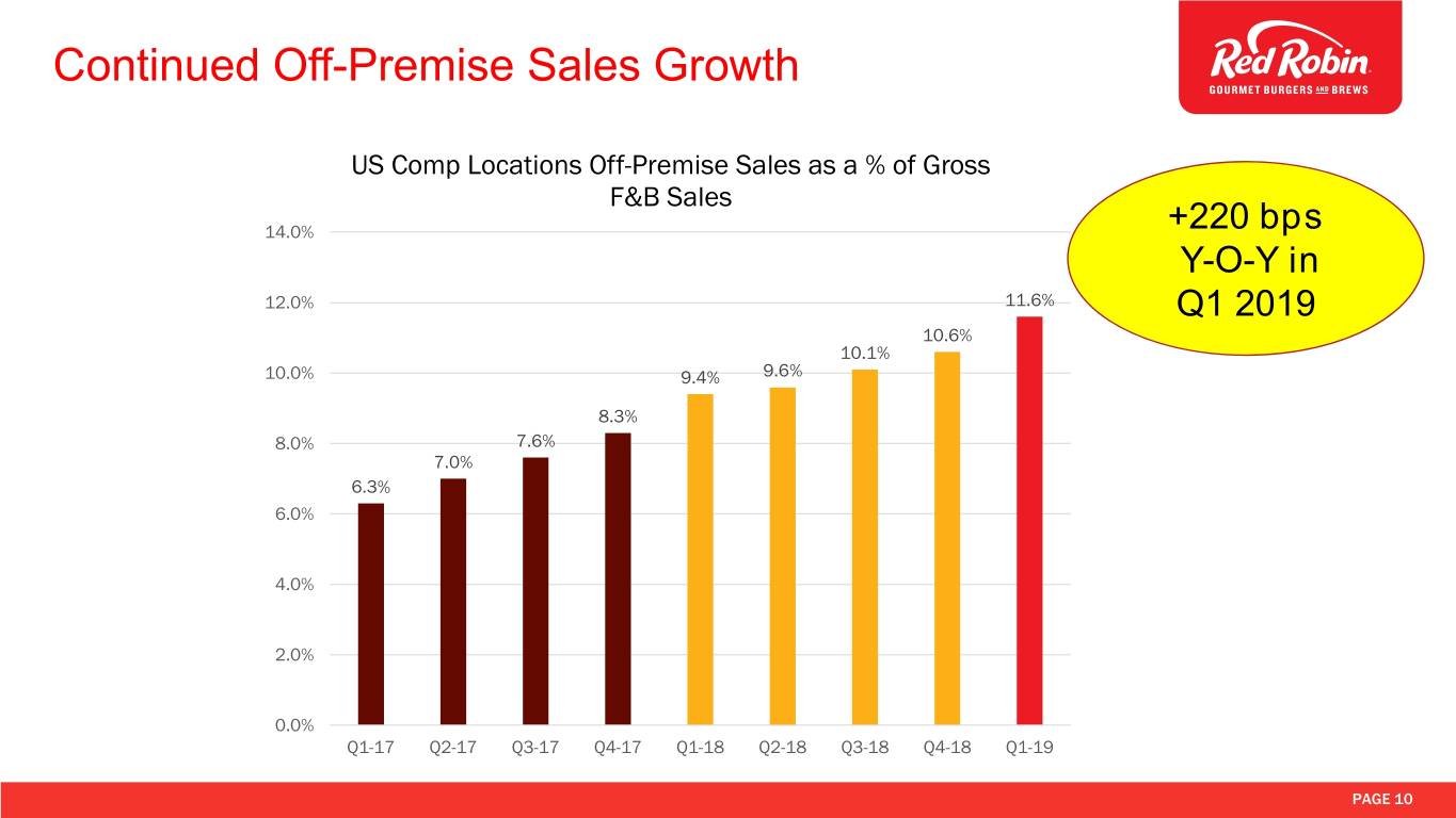 Continued Off-Premise Sales Growth US Comp Locations Off-Premise Sales as a % of Gross F&B Sales 14.0% +220 bps Y-O-Y in 12.0% 11.6% Q1 2019 10.6% 10.1% 10.0% 9.4% 9.6% 8.3% 8.0% 7.6% 7.0% 6.3% 6.0% 4.0% 2.0% 0.0% Q1-17 Q2-17 Q3-17 Q4-17 Q1-18 Q2-18 Q3-18 Q4-18 Q1-19 PAGE 10