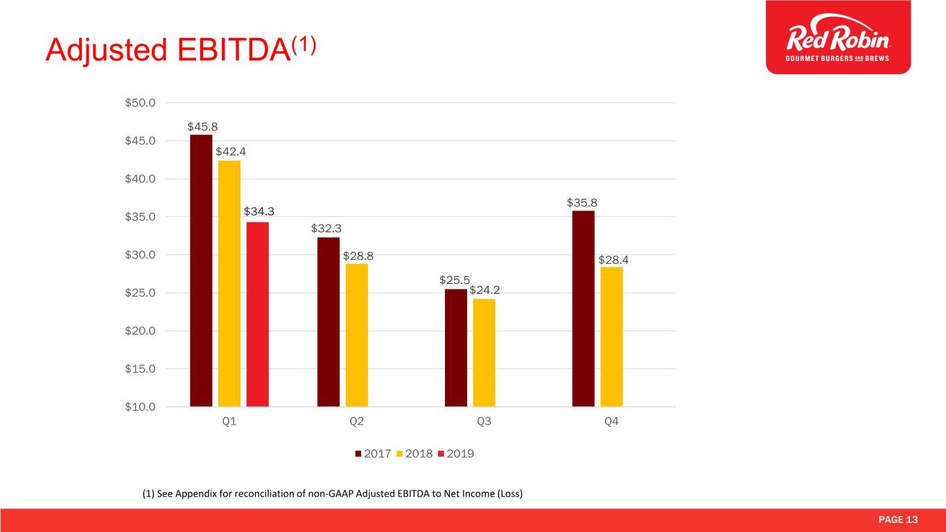 Q1-19 Restaurant Results % of Restaurant % of Restaurant Revenue Revenue Favorable Q1-19 Q1-18 (Unfavorable) Cost of sales 23.4% 23.8% 40 bps Labor 35.7% 34.5% (120 bps) Other operating 13.9% 13.3% (60 bps) Occupancy 8.7% 8.4% (30 bps) Restaurant Level Operating Profit(1) 18.3% 20.0% (170 bps) (1) See Appendix for reconciliation of non-GAAP restaurant-level operating profit to net income (loss) PAGE 12