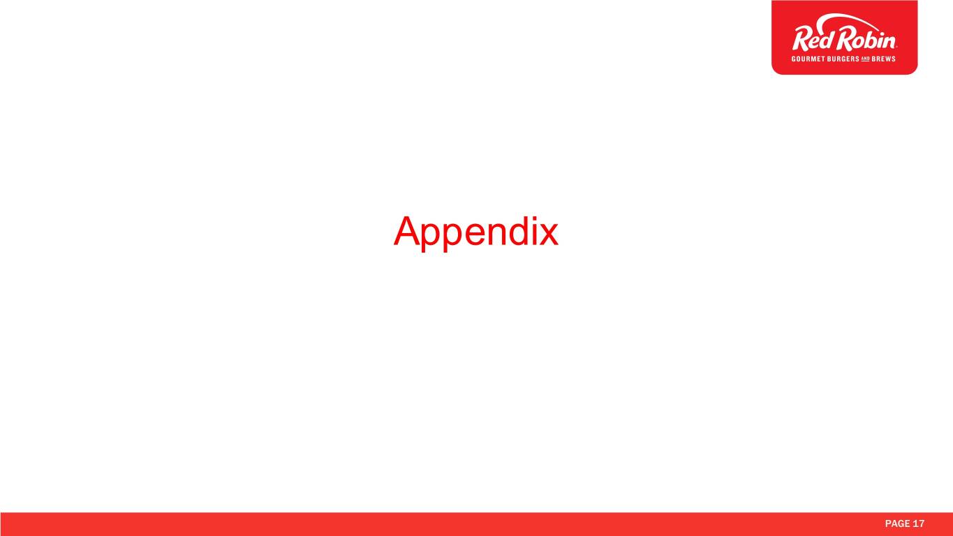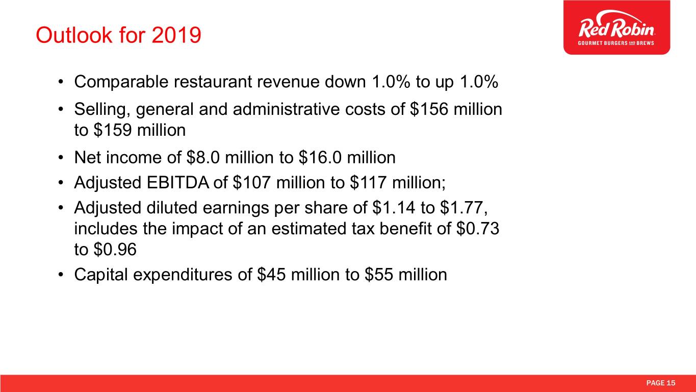 Outlook for 2019 • Comparable restaurant revenue down 1.0% to up 1.0% • Selling, general and administrative costs of $156 million to $159 million • Net income of $8.0 million to $16.0 million • Adjusted EBITDA of $107 million to $117 million; • Adjusted diluted earnings per share of $1.14 to $1.77, includes the impact of an estimated tax benefit of $0.73 to $0.96 • Capital expenditures of $45 million to $55 million PAGE 15