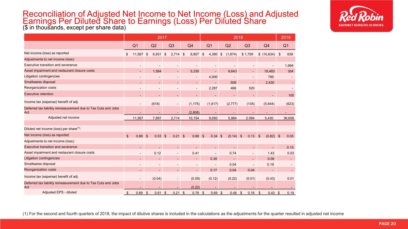 Reconciliation of Adjusted Net Income to Net Income (Loss) and Adjusted Earnings Per Diluted Share to Earnings (Loss) Per Diluted Share ($ in thousands, except per share data) 2017 2018 2019 Q1 Q2 Q3 Q4 Q1 Q2 Q3 Q4 Q1 Net income (loss) as reported $ 11,567 $ 6,931 $ 2,714 $ 8,807 $ 4,380 $ (1,874) $ 1,709 $ (10,634) $ 639 Adjustments to net income (loss): Executive transition and severance - - - - - - - - 1,994 Asset impairment and restaurant closure costs - 1,584 - 5,330 - 9,643 - 18,483 304 Litigation contingencies - - - - 4,000 - - 795 - Smallwares disposal - - - - - 506 - 2,430 - Reorganization costs - - - - 2,287 466 520 - Executive retention - - - - - - - - 100 Income tax (expense) benefit of adj. - (618) - (1,175) (1,617) (2,777) (135) (5,644) (623) Deferred tax liability remeasurement due to Tax Cuts and Jobs Act - - - (2,808) - - - - - Adjusted net income 11,567 7,897 2,714 10,154 9,050 5,964 2.094 5,430 36,658 Diluted net income (loss) per share(1): Net income (loss) as reported $ 0.89 $ 0.53 $ 0.21 $ 0.68 $ 0.34 $ (0.14) $ 0.13 $ (0.82) $ 0.05 Adjustments to net income (loss): Executive transition and severance - - - - - - - - 0.15 Asset impairment and restaurant closure costs - 0.12 - 0.41 - 0.74 - 1.43 0.03 Litigation contingencies - - - - 0.30 - - 0.06 - Smallwares disposal - - - - - 0.04 - 0.19 - Reorganization costs - - - - 0.17 0.04 0.04 - - Income tax (expense) benefit of adj. - (0.04) - (0.09) (0.12) (0.22) (0.01) (0.43) 0.01 Deferred tax liability remeasurement due to Tax Cuts and Jobs Act - - - (0.22) - - - - - Adjusted EPS - diluted $ 0.89 $ 0.61 $ 0.21 $ 0.78 $ 0.69 $ 0.46 $ 0.16 $ 0.43 $ 0.19 (1) For the second and fourth quarters of 2018, the impact of dilutive shares is included in the calculations as the adjustments for the quarter resulted in adjusted net income PAGE 20
