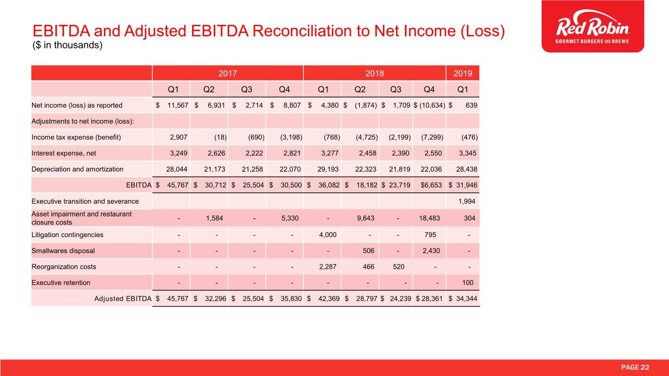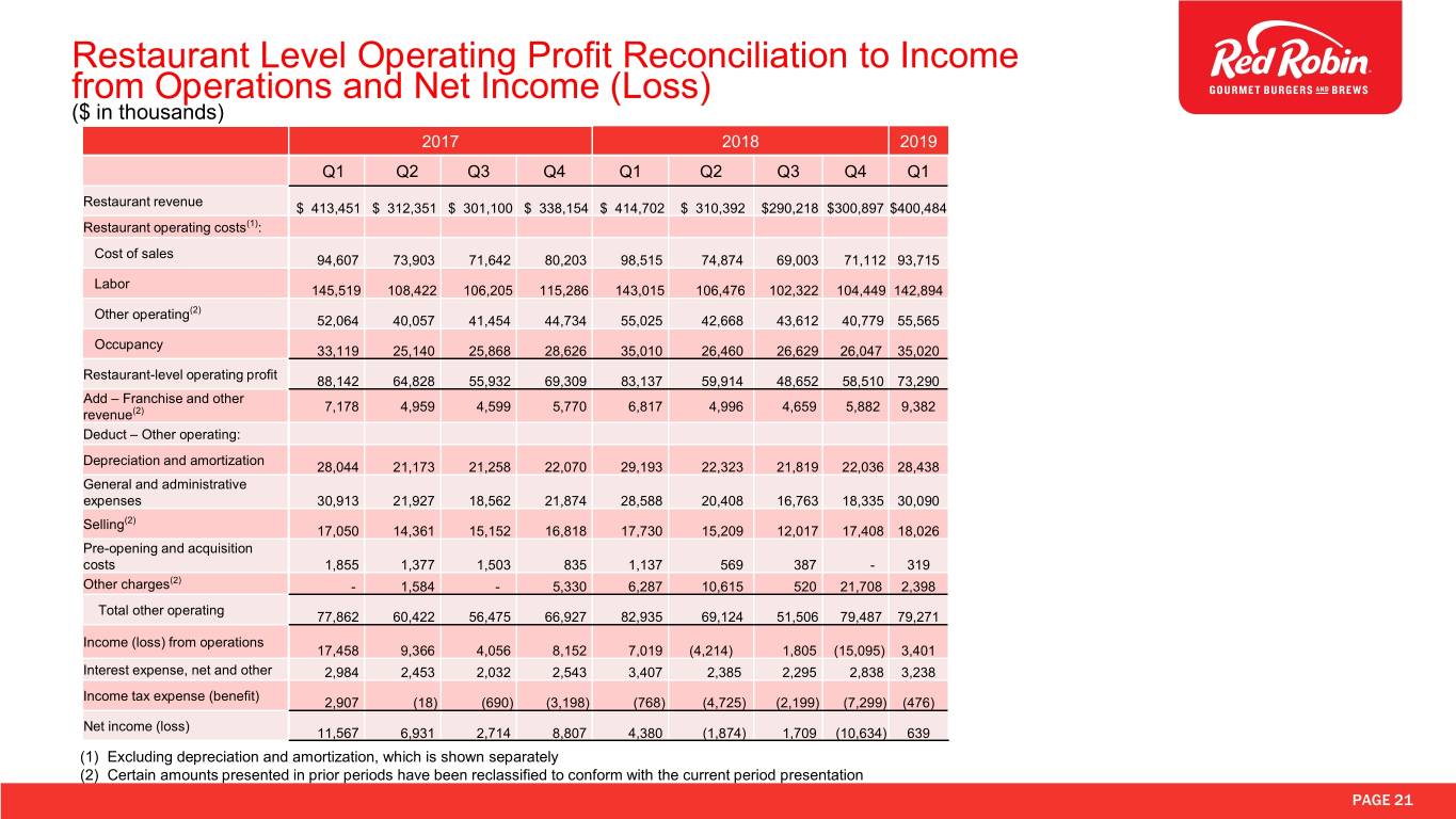 Restaurant Level Operating Profit Reconciliation to Income from Operations and Net Income (Loss) ($ in thousands) 2017 2018 2019 Q1 Q2 Q3 Q4 Q1 Q2 Q3 Q4 Q1 Restaurant revenue $ 413,451 $ 312,351 $ 301,100 $ 338,154 $ 414,702 $ 310,392 $290,218 $300,897 $400,484 Restaurant operating costs(1): Cost of sales 94,607 73,903 71,642 80,203 98,515 74,874 69,003 71,112 93,715 Labor 145,519 108,422 106,205 115,286 143,015 106,476 102,322 104,449 142,894 (2) Other operating 52,064 40,057 41,454 44,734 55,025 42,668 43,612 40,779 55,565 Occupancy 33,119 25,140 25,868 28,626 35,010 26,460 26,629 26,047 35,020 Restaurant-level operating profit 88,142 64,828 55,932 69,309 83,137 59,914 48,652 58,510 73,290 Add – Franchise and other 7,178 4,959 4,599 5,770 6,817 4,996 4,659 5,882 9,382 revenue(2) Deduct – Other operating: Depreciation and amortization 28,044 21,173 21,258 22,070 29,193 22,323 21,819 22,036 28,438 General and administrative expenses 30,913 21,927 18,562 21,874 28,588 20,408 16,763 18,335 30,090 (2) Selling 17,050 14,361 15,152 16,818 17,730 15,209 12,017 17,408 18,026 Pre-opening and acquisition costs 1,855 1,377 1,503 835 1,137 569 387 - 319 (2) Other charges - 1,584 - 5,330 6,287 10,615 520 21,708 2,398 Total other operating 77,862 60,422 56,475 66,927 82,935 69,124 51,506 79,487 79,271 Income (loss) from operations 17,458 9,366 4,056 8,152 7,019 (4,214) 1,805 (15,095) 3,401 Interest expense, net and other 2,984 2,453 2,032 2,543 3,407 2,385 2,295 2,838 3,238 Income tax expense (benefit) 2,907 (18) (690) (3,198) (768) (4,725) (2,199) (7,299) (476) Net income (loss) 11,567 6,931 2,714 8,807 4,380 (1,874) 1,709 (10,634) 639 (1) Excluding depreciation and amortization, which is shown separately (2) Certain amounts presented in prior periods have been reclassified to conform with the current period presentation PAGE 21