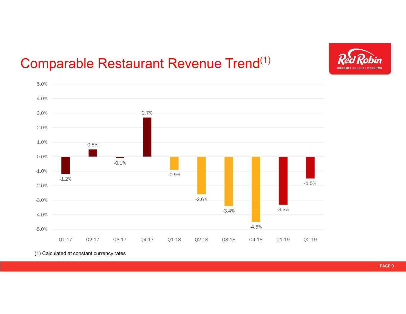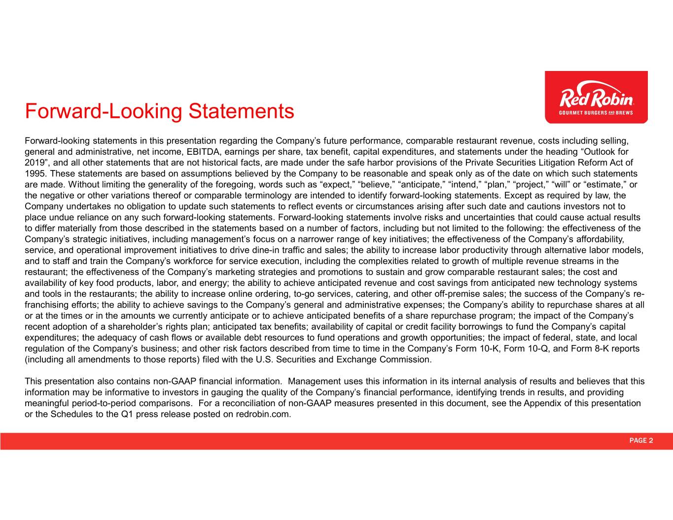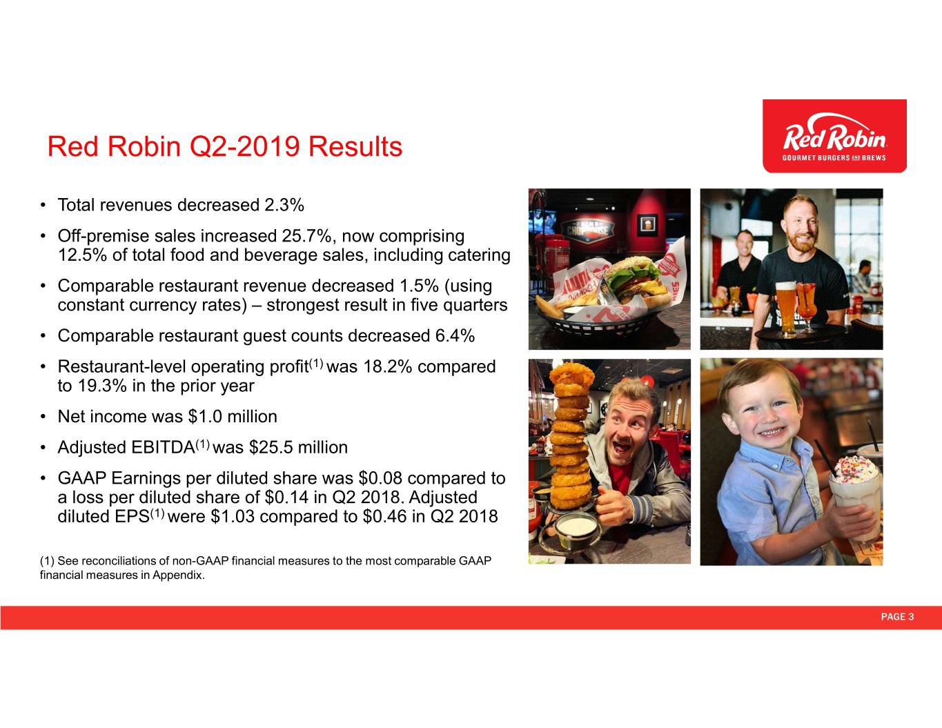 Forward-Looking Statements Forward-looking statements in this presentation regarding the Company’s future performance, comparable restaurant revenue, costs including selling, general and administrative, net income, EBITDA, earnings per share, tax benefit, capital expenditures, and statements under the heading “Outlook for 2019”, and all other statements that are not historical facts, are made under the safe harbor provisions of the Private Securities Litigation Reform Act of 1995. These statements are based on assumptions believed by the Company to be reasonable and speak only as of the date on which such statements are made. Without limiting the generality of the foregoing, words such as “expect,” “believe,” “anticipate,” “intend,” “plan,” “project,” “will” or “estimate,” or the negative or other variations thereof or comparable terminology are intended to identify forward-looking statements. Except as required by law, the Company undertakes no obligation to update such statements to reflect events or circumstances arising after such date and cautions investors not to place undue reliance on any such forward-looking statements. Forward-looking statements involve risks and uncertainties that could cause actual results to differ materially from those described in the statements based on a number of factors, including but not limited to the following: the effectiveness of the Company’s strategic initiatives, including management’s focus on a narrower range of key initiatives; the effectiveness of the Company’s affordability, service, and operational improvement initiatives to drive dine-in traffic and sales; the ability to increase labor productivity through alternative labor models, and to staff and train the Company’s workforce for service execution, including the complexities related to growth of multiple revenue streams in the restaurant; the effectiveness of the Company’s marketing strategies and promotions to sustain and grow comparable restaurant sales; the cost and availability of key food products, labor, and energy; the ability to achieve anticipated revenue and cost savings from anticipated new technology systems and tools in the restaurants; the ability to increase online ordering, to-go services, catering, and other off-premise sales; the success of the Company’s re- franchising efforts; the ability to achieve savings to the Company’s general and administrative expenses; the Company’s ability to repurchase shares at all or at the times or in the amounts we currently anticipate or to achieve anticipated benefits of a share repurchase program; the impact of the Company’s recent adoption of a shareholder’s rights plan; anticipated tax benefits; availability of capital or credit facility borrowings to fund the Company’s capital expenditures; the adequacy of cash flows or available debt resources to fund operations and growth opportunities; the impact of federal, state, and local regulation of the Company’s business; and other risk factors described from time to time in the Company’s Form 10-K, Form 10-Q, and Form 8-K reports (including all amendments to those reports) filed with the U.S. Securities and Exchange Commission. This presentation also contains non-GAAP financial information. Management uses this information in its internal analysis of results and believes that this information may be informative to investors in gauging the quality of the Company’s financial performance, identifying trends in results, and providing meaningful period-to-period comparisons. For a reconciliation of non-GAAP measures presented in this document, see the Appendix of this presentation or the Schedules to the Q1 press release posted on redrobin.com. PAGE 2