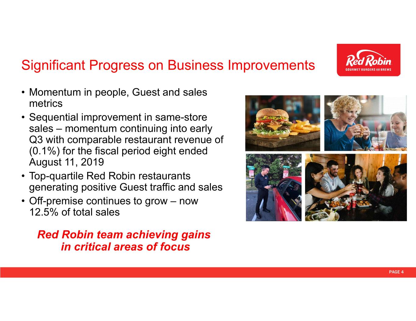 Red Robin Q2-2019 Results • Total revenues decreased 2.3% • Off-premise sales increased 25.7%, now comprising 12.5% of total food and beverage sales, including catering • Comparable restaurant revenue decreased 1.5% (using constant currency rates) – strongest result in five quarters • Comparable restaurant guest counts decreased 6.4% • Restaurant-level operating profit(1) was 18.2% compared to 19.3% in the prior year • Net income was $1.0 million • Adjusted EBITDA(1) was $25.5 million • GAAP Earnings per diluted share was $0.08 compared to a loss per diluted share of $0.14 in Q2 2018. Adjusted diluted EPS(1) were $1.03 compared to $0.46 in Q2 2018 (1) See reconciliations of non-GAAP financial measures to the most comparable GAAP financial measures in Appendix. PAGE 3