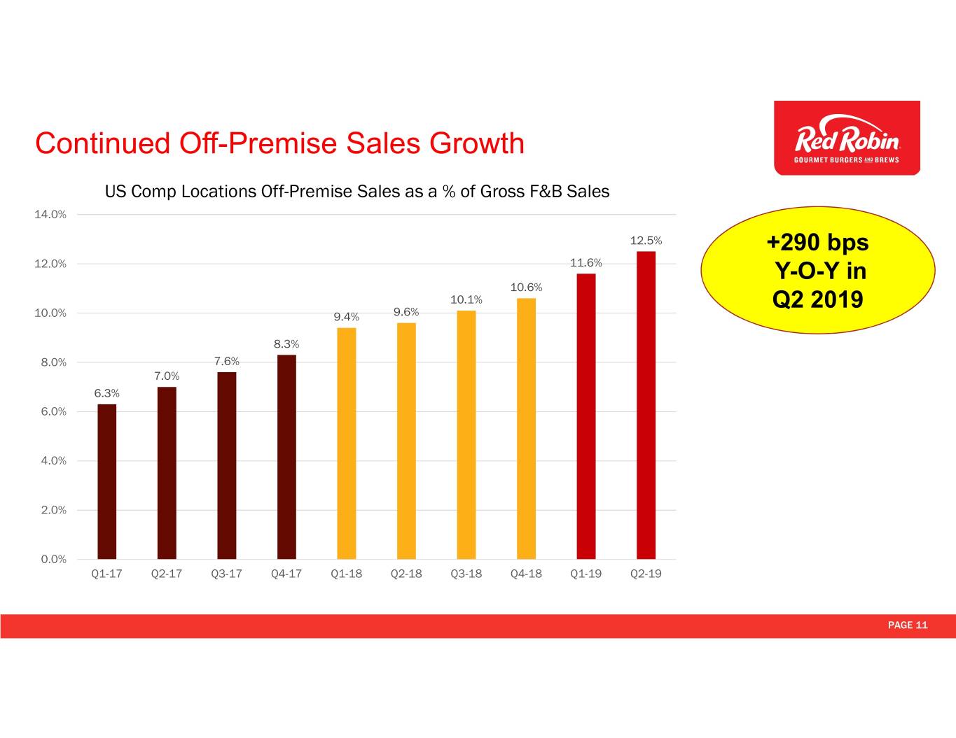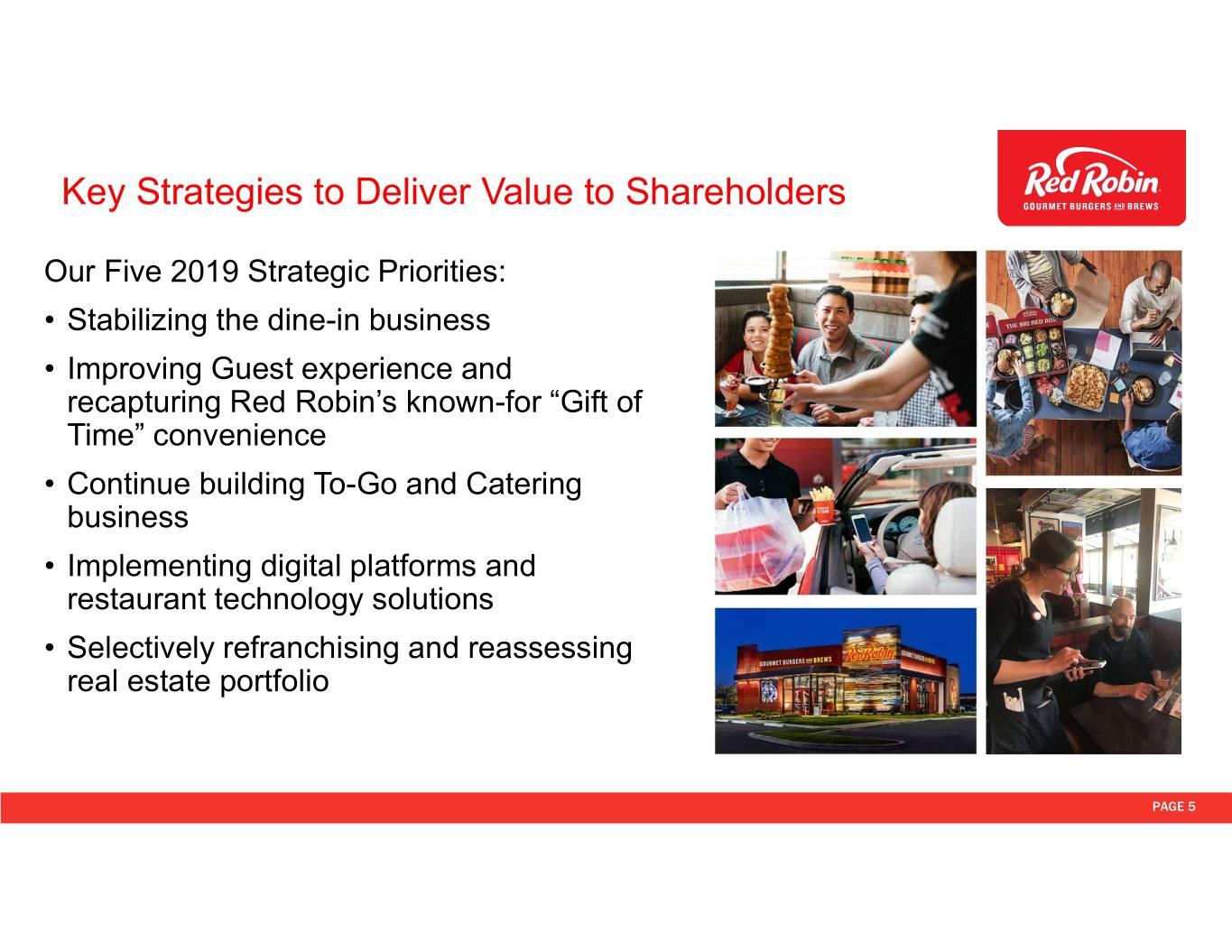 Significant Progress on Business Improvements • Momentum in people, Guest and sales metrics • Sequential improvement in same-store sales – momentum continuing into early Q3 with comparable restaurant revenue of (0.1%) for the fiscal period eight ended August 11, 2019 • Top-quartile Red Robin restaurants generating positive Guest traffic and sales • Off-premise continues to grow – now 12.5% of total sales Red Robin team achieving gains in critical areas of focus PAGE 4